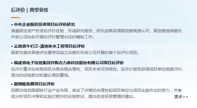 高質(zhì)量的項(xiàng)目實(shí)施是確保戰(zhàn)略謀劃精準(zhǔn)落地的必要環(huán)節(jié),后評(píng)價(jià)是保障高質(zhì)量項(xiàng)目實(shí)施重要手段。中咨公司在后評(píng)價(jià)相關(guān)咨詢(xún)服務(wù)中具備先進(jìn)的咨詢(xún)理念、完善的評(píng)估方法、成套的管理體系和制度,積極為各類(lèi)項(xiàng)目提供全方位、多維度、跨領(lǐng)域的咨詢(xún)服務(wù)。