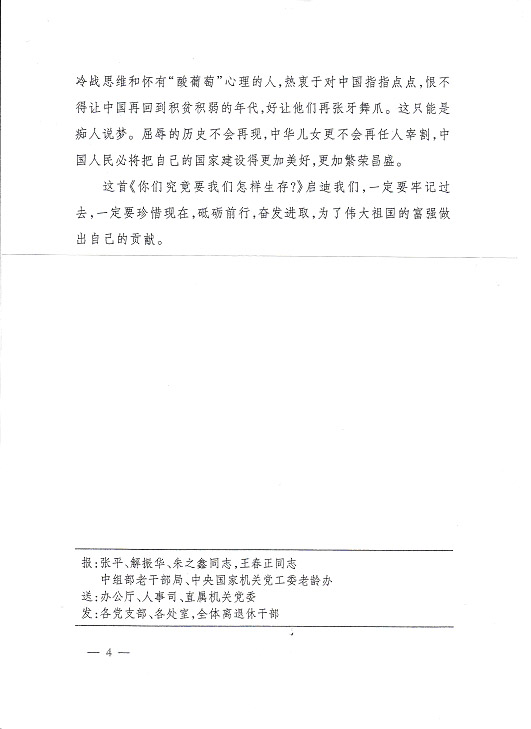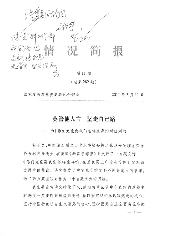 |   莫管他人言堅(jiān)走自己路編者按:國家發(fā)改委離退休干部局《情況簡(jiǎn)報(bào)》今年第11期刊載《莫管他人言堅(jiān)走自己路——由〈你們究竟要我們?cè)鯓由??〉所想到的》,是一篇洋溢著愛國主義情懷的好詩文,現(xiàn)根據(jù)公司領(lǐng)導(dǎo)的指示予以轉(zhuǎn)載,請(qǐng)各支部作為黨史學(xué)習(xí)的生動(dòng)教材,激發(fā)全體同志堅(jiān)定永遠(yuǎn)跟著黨走的決心,堅(jiān)持走中國特色社會(huì)主義道路,為全面實(shí)現(xiàn)小康社會(huì)而努力奮斗。