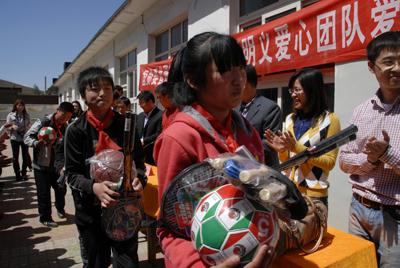 國資委直屬機關郭明義愛心團隊公益活動 穿過重重煙霧,沿著唯一一條通向?qū)W校的泥濘公路來到三河市段甲嶺鎮(zhèn)蔣福山小學。這里交通閉塞,環(huán)境污染嚴重,經(jīng)濟落后,但是這些都沒有使這里的孩子們放棄求學的欲望,反而激發(fā)起了大家更強烈的學習熱情和改變家鄉(xiāng)的愿望??吹?50多個孩子稚嫩、純樸、可愛的笑臉,志愿者們心情非常激動,紛紛把帶來的學習用品和體育用品送到孩子們手中。隨后,大家來到課堂上,為孩子們傳授科學文化知識,回答孩子們提出的問題,鼓勵他們熱愛學習,要努力學習科學文化知識,做一個勇敢、堅強、有益于社會的人。志愿者們在表演了自編的節(jié)目后,又來到操場上,和孩子們共同做游戲,并植下了愛心樹,祝愿孩子們能在社會各界愛心人士的幫助下和關心下茁壯成長,將來成為社會主義合格的建設者和接班人。