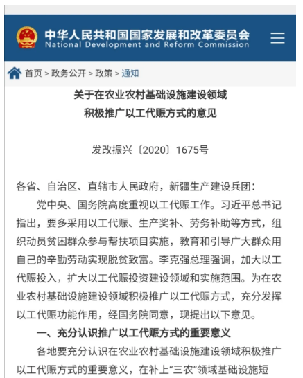 為推動鞏固拓展脫貧攻堅成果同鄉(xiāng)村振興有效銜接,更好發(fā)揮以工代賑“賑”的作用,帶動更多農(nóng)村低收入人口就近就業(yè)增收,近日,經(jīng)國務院同意后,國家發(fā)展改革委聯(lián)合有關部門和單位印發(fā)實施了《關于在農(nóng)業(yè)農(nóng)村基礎設施建設領域積極推廣以工代賑方式意見》(以下簡稱《意見》),進一步拓展了以工代賑的推廣范圍,細化了推廣以工代賑方式的組織及管理要求,明確了多部門協(xié)同推廣以工代賑方式的工作機制。 一、《意見》出臺正逢其時、意義重大 以工代賑是指通過組織農(nóng)村群眾參與工程建設獲取勞務報酬,以取代直接賑濟的一項幫扶政策。自1984年啟動實施以來,國家已累計安排以工代賑資金(含實物折資)超過1600億元。特別是脫貧攻堅戰(zhàn)打響以來,通過組織農(nóng)村貧困群眾和低收入人口參與當?shù)刂行⌒突A設施建設,幫助他們依靠自身勞動獲取報酬,達到了緩解貧困、激發(fā)增收致富內(nèi)生動力等效果,推動了扶貧同扶志扶智的有效結(jié)合。以工代賑項目的實施使得貧困地區(qū)生產(chǎn)生活條件顯著改善,為助力打贏脫貧攻堅戰(zhàn)發(fā)揮了重要作用,實現(xiàn)了減貧與區(qū)域發(fā)展的結(jié)合與統(tǒng)一,受到貧困地區(qū)干部群眾的廣泛歡迎。 黨中央、國務院高度肯定以工代賑政策所取得的成效。習近平總書記2017年、2018年在深度貧困地區(qū)脫貧攻堅座談會和打好精準脫貧攻堅戰(zhàn)座談會上強調(diào),要多采用以工代賑、生產(chǎn)獎補、勞務補助等方式,組織動員貧困群眾參與幫扶項目實施,教育和引導廣大群眾用自己的辛勤勞動實現(xiàn)脫貧致富。2018年6月,中共中央、國務院印發(fā)實施的《鄉(xiāng)村振興戰(zhàn)略規(guī)劃(2018-2022年)》明確指出,要結(jié)合基礎設施建設等工程建設,鼓勵采取以工代賑方式就近吸納農(nóng)村勞動力務工。今年疫情和災情發(fā)生以來,習近平總書記等中央領導同志高度重視農(nóng)村勞動力就業(yè)工作,李克強總理多次強調(diào)要加大以工代賑投入,帶動更多農(nóng)民工就近就業(yè)。 《意見》深入貫徹黨的十九屆五中全會精神,主動順應鞏固拓展脫貧攻堅成果、全面推進鄉(xiāng)村振興的新形勢新任務新要求,堅持守正創(chuàng)新,在強調(diào)組織群眾務工、發(fā)放勞務報酬等政策初衷的基礎上,對推廣以工代賑方式的實施范圍、建設領域、保障措施和聯(lián)動機制等進行了探索創(chuàng)新、拓展細化,從而推動這項好政策落到實處、取得實效。因此,《意見》的出臺,將有助于更好發(fā)揮以工代賑政策“賑”的作用,在拓寬農(nóng)村就業(yè)渠道、持續(xù)增加農(nóng)民收入、補上“三農(nóng)”領域突出短板、激發(fā)群眾內(nèi)生動力等方面帶來多重效益。 二、堅持守正,準確把握以工代賑政策初衷 一是繼續(xù)瞄準帶動農(nóng)村勞動力就業(yè)。對于采取以工代賑方式實施的農(nóng)業(yè)農(nóng)村基礎設施項目,有關行業(yè)主管部門要鼓勵引導項目實施單位按照就地就近的原則,優(yōu)先吸納脫貧不穩(wěn)定戶、邊緣易致貧戶和其他農(nóng)村低收入人口參與工程建設,在確保工程質(zhì)量和項目進度的前提下,盡量動員當?shù)剞r(nóng)村勞動力參與,最大可能提供更多就業(yè)崗位。積極開展技能培訓,解決農(nóng)村勞動力技能不足問題。 二是繼續(xù)強調(diào)勞務報酬及時足額發(fā)放。采取以工代賑方式實施的項目,同樣強調(diào)在前期工作階段就要明確用工計劃,對吸納當?shù)剞r(nóng)村勞動力情況等予以說明;項目立項審批階段,勞務報酬發(fā)放總量及發(fā)放比例是各級政府項目資金分配的重要考慮因素;在項目竣工驗收階段,勞務報酬支付標準、金額和發(fā)放名冊將作為重要考核依據(jù)。各地需結(jié)合實際,合理確定勞務報酬標準,盡量提高勞務報酬比例,確保及時足額發(fā)放。 三是繼續(xù)強化對采取以工代賑方式實施項目的督促指導。《意見》明確,對于采取以工代賑方式實施的農(nóng)業(yè)農(nóng)村基礎設施項目,按照招標投標法和村莊建設項目施行簡易審批的有關要求,可以不進行招標。省級發(fā)展改革部門要積極會同相關部門,采取工作會商、實地督導、聯(lián)合調(diào)研、定期調(diào)度等方式,加強工作和技術指導,協(xié)調(diào)幫助市縣解決在以工代賑方式推廣工作中出現(xiàn)的困難和問題。 三、注重創(chuàng)新,積極推廣以工代賑方式 一是明確以工代賑方式實施范圍并細化建設領域?!兑庖姟穼⒉扇∫怨ごc方式實施項目的領域,全面拓展到農(nóng)業(yè)農(nóng)村生產(chǎn)生活基礎設施、交通基礎設施、水利基礎設施、文化旅游基礎設施、林業(yè)草原基礎設施等五個領域,并作進一步細化。如,增加了災毀水毀農(nóng)村小型基礎設施恢復重建,防止因災致貧返貧。 二是強化以工代賑實施項目的投入保障力度。文件明確要求,各地要將符合條件的農(nóng)業(yè)農(nóng)村基礎設施項目按規(guī)定納入地方政府專項債券和抗疫特別國債支持范圍,并在組織實施專項債券和抗疫特別國債項目時,大力推廣以工代賑方式,多渠道擴大以工代賑實施規(guī)模。農(nóng)業(yè)農(nóng)村、交通、水利、文化旅游、林草、扶貧等部門在開展相關農(nóng)業(yè)農(