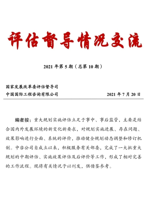 | 編者按:重大規(guī)劃實(shí)施評(píng)估立足于事中、事后監(jiān)管,主要是結(jié)合國內(nèi)外發(fā)展環(huán)境的新變化新要求,對(duì)規(guī)劃實(shí)施進(jìn)展、存在問題、效果影響進(jìn)行全面、系統(tǒng)的評(píng)價(jià),推動(dòng)健全規(guī)劃動(dòng)態(tài)調(diào)整和修訂機(jī)制。中咨公司自成立以來,積極服務(wù)有關(guān)部委,完成了一大批重大規(guī)劃的中期評(píng)估、實(shí)施效果評(píng)估及后評(píng)價(jià)等工作,形成了相對(duì)完善的工作流程?,F(xiàn)將有關(guān)情況予以刊發(fā),供借鑒參考。