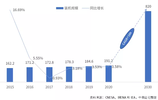 在落實(shí)“雙碳”目標(biāo)的重要背景下,我國能源結(jié)構(gòu)調(diào)整與新型電力系統(tǒng)建設(shè)勢(shì)在必行。隨著源網(wǎng)荷儲(chǔ)一體化深度協(xié)調(diào)互動(dòng),靈活的能源電力系統(tǒng)新模式將日漸顯現(xiàn)。這一進(jìn)程將催生大量儲(chǔ)能應(yīng)用場景與裝配需求,儲(chǔ)能將扮演不可替代的關(guān)鍵角色。2021年4月國家發(fā)展改革委、國家能源局印發(fā)的《關(guān)于加快推動(dòng)新型儲(chǔ)能發(fā)展的指導(dǎo)意見(征求意見稿)》(以下簡稱《指導(dǎo)意見》)強(qiáng)調(diào)儲(chǔ)能是支撐新型電力系統(tǒng)的重要技術(shù)和基礎(chǔ)裝備,對(duì)推動(dòng)能源綠色轉(zhuǎn)型、應(yīng)對(duì)極端事件、保障能源安全、促進(jìn)能源高質(zhì)量發(fā)展、實(shí)現(xiàn)碳達(dá)峰碳中和具有重要意義。 01國際、國內(nèi)儲(chǔ)能建設(shè)規(guī)模分析及預(yù)測(cè) 在碳中和背景下,國際國內(nèi)權(quán)威機(jī)構(gòu)、政府機(jī)關(guān)和中央企業(yè)結(jié)合當(dāng)前實(shí)際與發(fā)展要求,紛紛預(yù)測(cè)或提出儲(chǔ)能裝機(jī)規(guī)模的時(shí)間表、路線圖??傮w來看,在各國政府大力引導(dǎo)推動(dòng)下,國際國內(nèi)儲(chǔ)能市場將高速增長。 (一) 國際儲(chǔ)能建設(shè)規(guī)模 全球儲(chǔ)能裝機(jī)規(guī)模未來十年將高速增長。2018~2020年全球儲(chǔ)能新增裝機(jī)容量分別為5.5GW、6.3GW、6.5GW,三年年均復(fù)合增長率為3.5%。根據(jù)國際可再生能源署(IRENA)展望報(bào)告《電力儲(chǔ)存與可再生能源:2030年的成本與市場》的基本預(yù)測(cè)情景中提出,到2030年,抽水蓄能裝機(jī)將達(dá)到約230GW;另據(jù)國際能源署(IEA)《2050凈零排放:全球能源路線圖》報(bào)告中預(yù)測(cè),電池儲(chǔ)能到2030年裝機(jī)規(guī)模將達(dá)到590GW。2030年,在僅考慮抽水蓄能和電池儲(chǔ)能的情況下[1],儲(chǔ)能總裝機(jī)規(guī)模將達(dá)到約820GW,2020~2030年復(fù)合增長率約16%。 圖 1 2015-2020年全球儲(chǔ)能市場累計(jì)裝機(jī)規(guī)模(單位:GW) 電池儲(chǔ)能將成為儲(chǔ)能新增裝機(jī)的重要來源和未來儲(chǔ)能的主要裝機(jī)支撐。截至2020年底,全球儲(chǔ)能已投運(yùn)項(xiàng)目累計(jì)裝機(jī)規(guī)模為191GW,其中抽水蓄能裝機(jī)規(guī)模為172GW,占比90%,電池儲(chǔ)能裝機(jī)15GW,抽水蓄能占據(jù)絕對(duì)主導(dǎo)地位。根據(jù)IRENA和IEA預(yù)測(cè)的抽水蓄能和電池儲(chǔ)能裝機(jī)情況,到2030年,抽水蓄能裝機(jī)增加至230GW,2020~2030年復(fù)合增長率約3%,電池儲(chǔ)能裝機(jī)增加至590GW,2020~2030年復(fù)合增長率約44%。據(jù)此推算,到2030年,抽水蓄能裝機(jī)與電池儲(chǔ)能裝機(jī)比例約為1:2.5,電池儲(chǔ)能占比超過70%,成為未來儲(chǔ)能重要支撐性裝機(jī)來源。 圖 2 2020-2030年全球抽水蓄能和電池儲(chǔ)能累計(jì)裝機(jī)規(guī)模(單位:GW) (二) 國內(nèi)儲(chǔ)能建設(shè)規(guī)模 2020年我國新增儲(chǔ)能裝機(jī)2.6GW,儲(chǔ)能總裝機(jī)規(guī)模約34GW。根據(jù)CESA數(shù)據(jù),2020年我國新增儲(chǔ)能裝機(jī)2.6GW,其中抽水蓄能新增裝機(jī)容量為1.8GW,占比為69.5%,電池儲(chǔ)能新增裝機(jī)容量為0.79MW,占比30.4%。根據(jù)《中國電力行業(yè)年度發(fā)展報(bào)告2021》與CNESA數(shù)據(jù)推測(cè),截至2020年底,我國儲(chǔ)能總裝機(jī)規(guī)模約34GW,其中抽水蓄能約31GW,電池儲(chǔ)能約3GW。 到2025年,我國儲(chǔ)能裝機(jī)規(guī)模新增60GW以上,有望達(dá)到94GW?!吨笇?dǎo)意見》提出,計(jì)劃到2025年,新型儲(chǔ)能[2]裝機(jī)規(guī)模達(dá)30GW以上。此外,國家電網(wǎng)透露其在運(yùn)、在建抽水蓄能裝機(jī)規(guī)模達(dá)到62GW,“十四五”期間,將力爭新增開工20GW以上;南方電網(wǎng)透露,其到2025年將投產(chǎn)5GW抽水蓄能電站。保守估計(jì),“兩網(wǎng)”在“十四五”期間或?qū)⑿略?0GW以上抽水蓄能裝機(jī)?!笆奈濉逼陂g,我國新增抽水蓄能和電池儲(chǔ)能裝機(jī)或?qū)⒊^60GW。其中,新增裝機(jī)中一半為電池儲(chǔ)能、一半為抽水蓄能,電池儲(chǔ)能年復(fù)合增長率約為58%,抽水蓄能年復(fù)合增長率為14%,電池儲(chǔ)能增速將遠(yuǎn)高于抽水蓄能。 02 儲(chǔ)能發(fā)展面臨的挑戰(zhàn) 大力發(fā)展儲(chǔ)能已形成良好的政府間共識(shí)和技術(shù)基礎(chǔ),但仍面臨重重挑戰(zhàn)。 (一) 建設(shè)成本仍高昂,商業(yè)模式不清晰 電池儲(chǔ)能雖然相較其他儲(chǔ)能而言具備綜合性成本優(yōu)勢(shì),但全生命周期度電成本仍然偏高,位于0.5~1.5元/kwh之間,遠(yuǎn)高于進(jìn)入平價(jià)時(shí)代的風(fēng)光電價(jià)。據(jù)專家預(yù)測(cè),在目前體制機(jī)制下,儲(chǔ)能度電成本需要下降到0.1~0.3元,行業(yè)內(nèi)多數(shù)企業(yè)才能具備足夠的承擔(dān)能力,方可形成在全國大面積鋪開的商業(yè)模式。 (二)政策形勢(shì)不明朗,資本觀望氛圍濃 儲(chǔ)能對(duì)傳統(tǒng)電力系統(tǒng)而言是新生事物,相關(guān)部委關(guān)于儲(chǔ)能未來科學(xué)合理的監(jiān)管模式尚未達(dá)成共識(shí)。導(dǎo)致了行業(yè)發(fā)展在效率考量與安全考慮間徘徊、在政府主導(dǎo)與市場自主間徘徊,傳導(dǎo)至資本市場則體現(xiàn)為投資的忽冷忽熱,不利于形成穩(wěn)