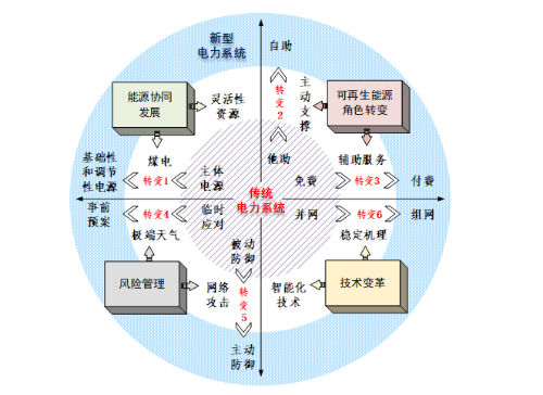 三、對(duì)策建議:實(shí)現(xiàn)“六個(gè)轉(zhuǎn)變” 總的來(lái)看,2030年之前,由于可再生能源比例相對(duì)較低,且煤電等電網(wǎng)友好型電源還發(fā)揮著基石作用,電力系統(tǒng)安全穩(wěn)定運(yùn)行的風(fēng)險(xiǎn)相對(duì)可控。2030年之后,隨著碳中和進(jìn)程加快,可再生能源占比持續(xù)上升,與此相關(guān)的風(fēng)險(xiǎn)和挑戰(zhàn)也將大幅上升。需提前做好認(rèn)識(shí)和行動(dòng)的準(zhǔn)備,堅(jiān)持居安思危、未雨綢繆、系統(tǒng)施策,做到“六個(gè)轉(zhuǎn)變”(見(jiàn)圖2),保障電力系統(tǒng)安全穩(wěn)定運(yùn)行。