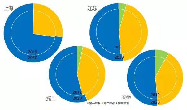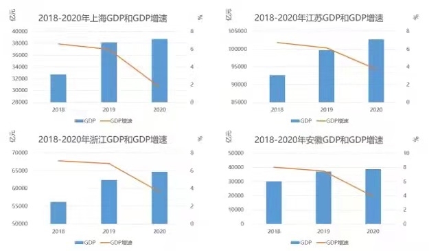 摘要:長江三角洲地區(qū)在我國的經(jīng)濟(jì)社會(huì)發(fā)展中發(fā)揮著重要引領(lǐng)和支撐作用,黨中央國務(wù)院對(duì)促進(jìn)長三角地區(qū)一體化發(fā)展高度重視,提出打造“面向全球、輻射亞太、引領(lǐng)全國的世界級(jí)城市群”的戰(zhàn)略要求。本文在對(duì)長三角地區(qū)范圍內(nèi)的上海市、浙江省、江蘇省、安徽省經(jīng)濟(jì)發(fā)展水平綜合對(duì)比的基礎(chǔ)上,分析了長三角經(jīng)濟(jì)增長的三大動(dòng)能情況,最后提出了長三角更高質(zhì)量一體化發(fā)展的展望。 關(guān)鍵字:長三角;區(qū)域經(jīng)濟(jì);一體化發(fā)展 一、長三角區(qū)域經(jīng)濟(jì)發(fā)展水平對(duì)比 2020年,長江三角洲地區(qū)一市三?。ㄉ虾J小⒔K省、浙江省、安徽?。┙?jīng)濟(jì)總量占全國經(jīng)濟(jì)的比重接近四分之一,進(jìn)一步凸顯對(duì)全國經(jīng)濟(jì)的支撐引領(lǐng)作用。面對(duì)國內(nèi)外風(fēng)險(xiǎn)挑戰(zhàn)明顯上升和新冠疫情爆發(fā)的復(fù)雜局面,長三角地區(qū)在“共抓大保護(hù)、不搞大開發(fā)”精神指引下,堅(jiān)持穩(wěn)中求進(jìn)工作總基調(diào),積極落實(shí)高質(zhì)量發(fā)展總要求,經(jīng)濟(jì)增長保持韌性,創(chuàng)新驅(qū)動(dòng)力穩(wěn)步提升,圍繞一體化和高質(zhì)量兩大關(guān)鍵,長三角一體化發(fā)展進(jìn)入了新階段。 2021年,長三角地區(qū)經(jīng)濟(jì)增長繼續(xù)保持良好的態(tài)勢(shì),地區(qū)經(jīng)濟(jì)總量和人均經(jīng)濟(jì)規(guī)模持續(xù)擴(kuò)大,在全國經(jīng)濟(jì)發(fā)展格局中的重要性進(jìn)一步凸顯,經(jīng)濟(jì)發(fā)展質(zhì)量不斷提高,且省際經(jīng)濟(jì)發(fā)展的差距在逐步縮小。 (一)經(jīng)濟(jì)規(guī)模持續(xù)擴(kuò)大 2020年,受新冠疫情影響,長三角一市三省實(shí)現(xiàn)地區(qū)生產(chǎn)總值24.4萬億元,平均增速為3.2%,較2019年增速下降近一半。人均GDP達(dá)到114471元,同比增長2.4%,高出全國平均水平(72371元)近42100元,領(lǐng)先幅度進(jìn)一步擴(kuò)大。在4個(gè)省市中,GDP增速低于全國的只有上海市(1.7%),人均GDP規(guī)模低于全國水平的有安徽省??傮w來看,長三角地區(qū)經(jīng)濟(jì)實(shí)現(xiàn)了持續(xù)穩(wěn)定增長,人均經(jīng)濟(jì)規(guī)模繼續(xù)攀升,領(lǐng)先全國同期水平的幅度進(jìn)一步擴(kuò)大。 數(shù)據(jù)來源:根據(jù)長三角地區(qū)各省市統(tǒng)計(jì)年鑒及公報(bào)整理 圖1 2018-2020年長三角地區(qū)GDP和GDP增速情況 (二)產(chǎn)業(yè)結(jié)構(gòu)進(jìn)一步優(yōu)化 2020年,長三角地區(qū)生產(chǎn)總值占全國的比重達(dá)到24.1%,同比提升0.2個(gè)百分點(diǎn),在全國經(jīng)濟(jì)總量中的比重不斷上升。產(chǎn)業(yè)結(jié)構(gòu)進(jìn)一步優(yōu)化,第三產(chǎn)業(yè)占比均超過了50%,其中,服務(wù)業(yè)發(fā)展勢(shì)頭強(qiáng)勁,工業(yè)經(jīng)濟(jì)明顯好轉(zhuǎn),戰(zhàn)略性新興產(chǎn)業(yè)加速成長,重點(diǎn)行業(yè)表現(xiàn)突出。但省際之間產(chǎn)業(yè)結(jié)構(gòu)、產(chǎn)業(yè)體系和重點(diǎn)產(chǎn)業(yè)發(fā)展情況仍存在明顯的地區(qū)差異,其中,上海的第三產(chǎn)業(yè)比重超過70%,安徽的第三產(chǎn)業(yè)比重超過50%。 從各省市產(chǎn)業(yè)結(jié)構(gòu)比較來看,上海第三產(chǎn)業(yè)產(chǎn)值占比高出第二產(chǎn)業(yè)45.7個(gè)百分點(diǎn),第二產(chǎn)業(yè)占比不足30%,第一產(chǎn)業(yè)占比微乎其微,服務(wù)型經(jīng)濟(jì)主導(dǎo)的產(chǎn)業(yè)結(jié)構(gòu)特征極為明顯;浙江第一產(chǎn)業(yè)占比3.3%,第三產(chǎn)業(yè)占地區(qū)生產(chǎn)總值的比重高出第二產(chǎn)業(yè)10個(gè)百分點(diǎn)以上,形成典型的“三二一”型產(chǎn)業(yè)結(jié)構(gòu);江蘇第二產(chǎn)業(yè)比重與第三產(chǎn)業(yè)比重相差不大,呈現(xiàn)服務(wù)業(yè)與工業(yè)并重的產(chǎn)業(yè)格局;安徽產(chǎn)業(yè)結(jié)構(gòu)正處于服務(wù)業(yè)工業(yè)并重向“三二一”型產(chǎn)業(yè)結(jié)構(gòu)轉(zhuǎn)型的過程中。 數(shù)據(jù)來源:根據(jù)長三角地區(qū)各省市統(tǒng)計(jì)年鑒及公報(bào)整理 圖2 2019-2020年長三角地區(qū)三產(chǎn)結(jié)構(gòu)變化情況 (三)產(chǎn)業(yè)發(fā)展特色顯著 打造世界級(jí)產(chǎn)業(yè)集群和標(biāo)志性產(chǎn)業(yè)鏈,是長三角地區(qū)實(shí)現(xiàn)更高質(zhì)量一體化發(fā)展的重要內(nèi)容。2020年,長三角地區(qū)的服務(wù)業(yè)產(chǎn)值占比均超過了GDP的一半。上海服務(wù)業(yè)中增長最快的是信息傳輸、軟件和信息技術(shù)服務(wù)業(yè),增速接近20%;江蘇服務(wù)業(yè)中的金融、交通倉儲(chǔ)運(yùn)輸和郵政等增速明顯,互聯(lián)網(wǎng)及相關(guān)服務(wù)業(yè)增速最快;浙江以新產(chǎn)業(yè)、新業(yè)態(tài)、新模式為主要特征的“三新”經(jīng)濟(jì)增加值占GDP的25%以上;安徽以互聯(lián)網(wǎng)信息技術(shù)、商務(wù)服務(wù)等新興行業(yè)為代表的規(guī)模以上其他營利性服務(wù)業(yè)營業(yè)收入增長超過20%,帶動(dòng)優(yōu)勢(shì)凸顯。 2020年,長三角地區(qū)的工業(yè)經(jīng)濟(jì)發(fā)展均有所好轉(zhuǎn)。上海規(guī)模以上工業(yè)增加值比2019年