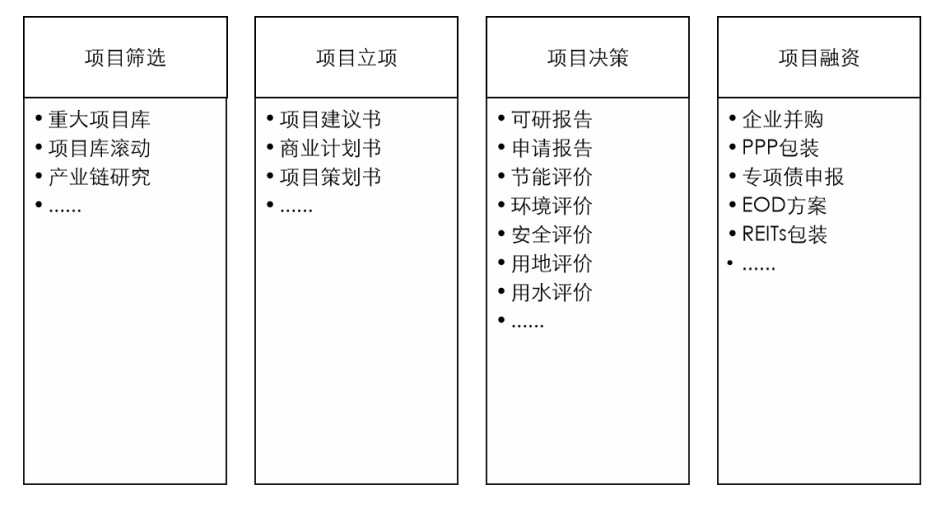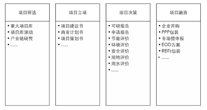 | 在各地項目謀劃實踐中,項目謀劃有狹義與廣義兩種范疇。所謂狹義的項目謀劃,是為配合發(fā)展規(guī)劃、區(qū)域規(guī)劃或?qū)m椧?guī)劃的落地實施,提高規(guī)劃的針對性和操作性,研究提出未來一段時間部署實施的重大項目安排,包括篩選項目、提出重大項目入庫清單,以及根據(jù)新形勢新變化新要求,動態(tài)優(yōu)化調(diào)整重大項目庫。所謂廣義的項目謀劃,則覆蓋了整個項目前期階段,包括研究重大項目總體安排、開展重點項目前期研究等任務(wù)。本文探討廣義的項目謀劃,包括階段劃分和主要工作。 一、項目謀劃的階段劃分 基于全過程管理理念,世界銀行、亞洲開發(fā)銀行等國際金融組織通常將項目周期劃分為“項目提出與篩選、項目前期研究、項目評估與決策、項目建設(shè)實施、項目運營及后評價”五個階段。借鑒國際項目管理經(jīng)驗,國內(nèi)將“項目提出與篩選、項目前期研究、項目評估與決策”三個階段納入項目前期管理工作,同時建立和強化了項目中期監(jiān)督管理和后評價制度。 項目謀劃覆蓋整個項目前期,可劃分為“項目篩選、項目立項、項目決策和項目融資”四個階段,這是項目研究逐步深入、認識不斷深化、質(zhì)量漸次提高、成果優(yōu)化完善的過程,涉及投資機會研究、項目初步可研和可行性研究,項目儲備、包裝、申報,包括企業(yè)并購、專項債、PPP、EOD和REITs方案等具體工作。 圖1 項目周期 圖2 項目謀劃的主要階段 二、項目謀劃的主要工作 (一)項目篩選階段 項目篩選階段的主要工作是研究提出重大項目清單,并根據(jù)形勢變化進行優(yōu)化調(diào)整,以及開展重點產(chǎn)業(yè)鏈創(chuàng)新研究,提出產(chǎn)業(yè)鏈、產(chǎn)業(yè)空間布局圖、企業(yè)分工協(xié)作鏈等。 ——研究提出重大項目清單。近年來,各地在開展國民經(jīng)濟和社會發(fā)展五年規(guī)劃、產(chǎn)業(yè)發(fā)展和區(qū)域發(fā)展等中長期規(guī)劃時,為了提高規(guī)劃的針對性、指導(dǎo)性和可操作性,都以重大項目為抓手,優(yōu)先保障土地、能源等要素資源,研究提出未來一段時期的重大項目建設(shè)安排,并在資金財政、金融信貸等方面予以支持。本階段項目謀劃的主要工作是分析發(fā)展基礎(chǔ),查找問題短板,把握政策規(guī)劃,跟蹤行業(yè)動向,研究市場需求,征求篩選提出重大項目清單,納入各地發(fā)改委重大項目庫管理。各地在推薦申報中央和地方財政預(yù)算各類專項時,一般也會將項目入庫作為前置條件。 ——動態(tài)優(yōu)化調(diào)整項目清單。由于中長期規(guī)劃執(zhí)行期通常都在3-5年或是5-10年,有的甚至長達10-15年。在此期間,市場、技術(shù)、政策、規(guī)劃、環(huán)境、資源等都可能發(fā)生變化,甚至出現(xiàn)重大變化。比如2020年開始持續(xù)三年的全球新冠疫情、美國主導(dǎo)的逆全球化和我國構(gòu)建“以國內(nèi)大循環(huán)為主體、國內(nèi)國際雙循環(huán)相互促進”新發(fā)展格局、全面建設(shè)社會主義現(xiàn)代化國家。面對新階段新形勢新任務(wù),各地在開展“十四五”規(guī)劃中期評估中,都會重新審視規(guī)劃目標、指標和主要任務(wù),以及重大項目安排,并對規(guī)劃進行修編,對重大項目安排進行調(diào)整、補充、完善。 ——重點產(chǎn)業(yè)鏈創(chuàng)新研究。開展產(chǎn)業(yè)鏈創(chuàng)新研究,從中尋找關(guān)鍵薄弱環(huán)節(jié),提出“延鏈、補鏈、強鏈”重大項目,建立產(chǎn)業(yè)鏈推進鏈長制,強力推動產(chǎn)業(yè)集聚集群發(fā)展,是各地項目謀劃的創(chuàng)新模式。產(chǎn)業(yè)鏈作為暢通國民經(jīng)濟循環(huán)的橋梁和紐帶,在構(gòu)建雙循環(huán)新發(fā)展格局中的作用至關(guān)重要。通過產(chǎn)業(yè)鏈創(chuàng)新研究,聚焦龍頭企業(yè)不強、產(chǎn)業(yè)鏈條不完善、整體產(chǎn)業(yè)規(guī)模待提升等問題,以構(gòu)建全產(chǎn)業(yè)鏈生態(tài)、增強產(chǎn)業(yè)安全韌性為目標,加快促進產(chǎn)業(yè)鏈上下游、產(chǎn)供銷、大中小企業(yè)協(xié)同發(fā)展,暢通產(chǎn)業(yè)循環(huán)、市場循環(huán)、經(jīng)濟社會循環(huán),推動產(chǎn)業(yè)高質(zhì)量發(fā)展。 (二)項目立項階段 項目立項階段的主要工作是預(yù)可行性研究,編制項目預(yù)可行性研究報告、商業(yè)計劃書、項目策劃書等。 ——預(yù)可行性研究。又稱初步可行性研究、項目建議書或立項申請報告。由項目發(fā)起人(籌建單位或項目法人)根據(jù)國家和地方中長期規(guī)劃、產(chǎn)業(yè)政策、生產(chǎn)力布局、國內(nèi)外市場、所在地的內(nèi)外部條件,就某一新建、擴建或改造項目提出的項目建議文件,是對擬建項目的框架性的總體設(shè)想。重點論述項目建設(shè)的必要性,把項目投資的設(shè)想變?yōu)楦怕缘耐顿Y建議。按照國內(nèi)投資項目管理制度規(guī)定,項目建議書是項目發(fā)起人向政府投資主管部門上報以獲得項目立項的申報文件,為項目審批機關(guān)作出初步?jīng)Q策提供必要依據(jù)。項目建議書也是大型、復(fù)雜投資項目前期研究不可或缺的重要環(huán)節(jié),可以減少項目選擇的盲目性,為下一步可行性研究打下基礎(chǔ)。 ——編制商業(yè)計劃書。商業(yè)計劃書