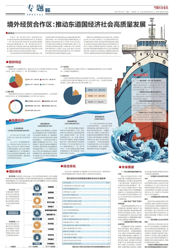 編者按        今年是“一帶一路”倡議提出十周年。境外經(jīng)貿(mào)合作區(qū)作為國內(nèi)國際雙循環(huán)的重要實踐平臺,積極踐行“一帶一路”倡議和國際產(chǎn)能合作,致力于推動東道國的經(jīng)濟社會高質(zhì)量發(fā)展,把“一帶一路”建設(shè)成為和平之路、繁榮之路、開放之路、綠色之路、創(chuàng)新之路和文明之路,為推動開放型世界經(jīng)濟體系建設(shè)、增進各國人民福祉、構(gòu)建人類命運共同體作出新的更大貢獻。        20世紀90年代末期,中國民營企業(yè)開始擴展自身的海外業(yè)務(wù)。這一時期,海外園區(qū)大多服務(wù)于原始初創(chuàng)企業(yè),屬于市場化自發(fā)行為,少有大規(guī)模引進其他大型企業(yè),園區(qū)發(fā)展相對較慢。2006年以來,在商務(wù)部和財政部等相關(guān)部門的不斷規(guī)范與大力推動下,境外經(jīng)貿(mào)合作區(qū)建設(shè)實現(xiàn)長足發(fā)展,合作區(qū)數(shù)量持續(xù)增長,基礎(chǔ)設(shè)施建設(shè)穩(wěn)步推進,產(chǎn)業(yè)集聚效應逐漸顯現(xiàn)。2013年,中國提出建設(shè)“絲綢之路經(jīng)濟帶”和“21世紀海上絲綢之路”重大倡議,為境外經(jīng)貿(mào)合作區(qū)建設(shè)指明了方向。境外經(jīng)貿(mào)合作區(qū)建設(shè)快速推進、規(guī)模不斷擴大,成為推進共建“一帶一路”建設(shè)的重要抓手、國際產(chǎn)能合作的重要平臺、深化雙邊關(guān)系的靚麗“名片”。        為全面反映境外經(jīng)濟貿(mào)易合作區(qū)的建設(shè)成就,不斷完善境外經(jīng)貿(mào)合作區(qū)的評價機制,積極推動境外經(jīng)貿(mào)合作區(qū)和共建“一帶一路”高質(zhì)量發(fā)展不斷取得新成效,中國國際工程咨詢有限公司基于多年研究積累與實踐成果,在商務(wù)部的精心指導,各省市商務(wù)廳和相關(guān)政府部門、金融機構(gòu),以及73家境外經(jīng)貿(mào)合作區(qū)的大力支持下,系統(tǒng)、全面、客觀、公正地開展了境外經(jīng)貿(mào)合作區(qū)高質(zhì)量發(fā)展評價工作,形成《境外經(jīng)濟貿(mào)易合作區(qū)高質(zhì)量發(fā)展報告2023》。        根據(jù)中咨公司數(shù)據(jù)庫統(tǒng)計,截至2022年底,中國已經(jīng)在亞洲、非洲、歐洲、美洲設(shè)立了125家境外經(jīng)貿(mào)合作區(qū),在協(xié)調(diào)東道國生產(chǎn)資源、使用具有競爭優(yōu)勢的低成本勞動力、享受優(yōu)惠關(guān)稅政策,推動中國企業(yè)與東道國形成產(chǎn)業(yè)協(xié)同、產(chǎn)業(yè)鏈上下游聚集方面取得了良好成效。同時,未來還將重點聚焦創(chuàng)新對外投資合作方式,優(yōu)化對外投資結(jié)構(gòu)和布局,完善境外生產(chǎn)服務(wù)網(wǎng)絡(luò),發(fā)揮境外經(jīng)貿(mào)合作區(qū)平臺作用,推動境外經(jīng)貿(mào)合作區(qū)綠色發(fā)展和數(shù)字化轉(zhuǎn)型。        報告總結(jié)并推廣境外經(jīng)貿(mào)合作區(qū)發(fā)展典型案例。伴隨全球化進程的不斷加快以及共建“一帶一路”建設(shè)的深入推進,境外經(jīng)貿(mào)合作區(qū)成為我國與“一帶一路”共建國家經(jīng)濟合作的新方式及未來發(fā)展的新趨勢。本次報告從經(jīng)濟引領(lǐng)、綠色發(fā)展、開放共享等角度梳理總結(jié)高質(zhì)量發(fā)展的典型案例,以期能夠有效推廣可復制的成功經(jīng)驗,為我國境外經(jīng)貿(mào)合作區(qū)建設(shè)提供重要的參考借鑒。 境外經(jīng)貿(mào)合作區(qū)高質(zhì)量發(fā)展20強出爐        此次評價以“創(chuàng)新、協(xié)調(diào)、綠色、開放、共享”的新發(fā)展理念為基本原則,建立五大領(lǐng)域三級指標的綜合評價指標體系,對73個境外經(jīng)貿(mào)合作區(qū)在經(jīng)濟引領(lǐng)、創(chuàng)新驅(qū)動、綠色生態(tài)、開放共享、風險防控等方面的高質(zhì)量發(fā)展狀況進行全面系統(tǒng)地分析評價,結(jié)合新形勢新要求提出具體展望與相關(guān)建議,總結(jié)提煉合作區(qū)高質(zhì)量發(fā)展的經(jīng)驗做法與典型案例,測算得出“境外經(jīng)貿(mào)合作區(qū)高質(zhì)量發(fā)展排名”,并最終形成《境外經(jīng)濟貿(mào)易合作區(qū)高質(zhì)量發(fā)展報告2023》。 境外經(jīng)貿(mào)合作區(qū)高質(zhì)量發(fā)展20強排名中,亞洲12家,占比60.0%,明顯高于亞洲境外經(jīng)貿(mào)合作區(qū)的數(shù)量占比,亞洲境外經(jīng)貿(mào)合作區(qū)發(fā)展質(zhì)量總體較高。亞洲排名靠前的境外經(jīng)貿(mào)合作區(qū)主要包括中國印尼綜合產(chǎn)業(yè)園區(qū)青山園區(qū)、印尼緯達貝工業(yè)園、文萊大摩拉島石油化工園區(qū)、柬埔寨西哈努克港經(jīng)濟特區(qū)、阿治曼中國城等。 現(xiàn)狀特征 1、區(qū)域分布        根據(jù)中咨公司數(shù)據(jù)庫統(tǒng)計,截至 2022 年底,中國境外經(jīng)貿(mào)合作區(qū)達到125家。其中,112家位于“一帶一路”共建國家,占比超89.6%。 2、園區(qū)類型        經(jīng)貿(mào)合作區(qū)以加工制造型為主,科技研發(fā)型相對較少。125 家境外經(jīng)貿(mào)合作區(qū)中,加工制造型數(shù)量最多,為57家,占比45.6%。 3、產(chǎn)業(yè)特征        境外經(jīng)貿(mào)合作區(qū)以傳統(tǒng)產(chǎn)業(yè)為主,產(chǎn)業(yè)結(jié)構(gòu)層次相對