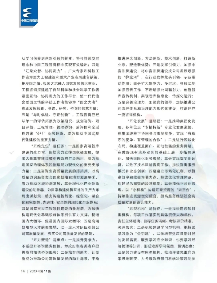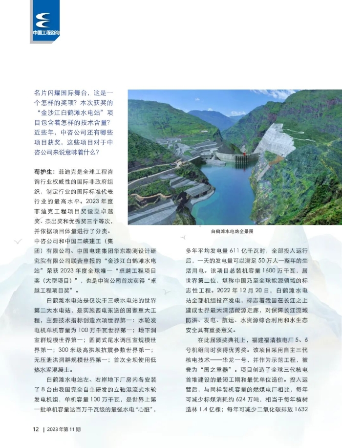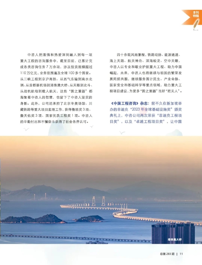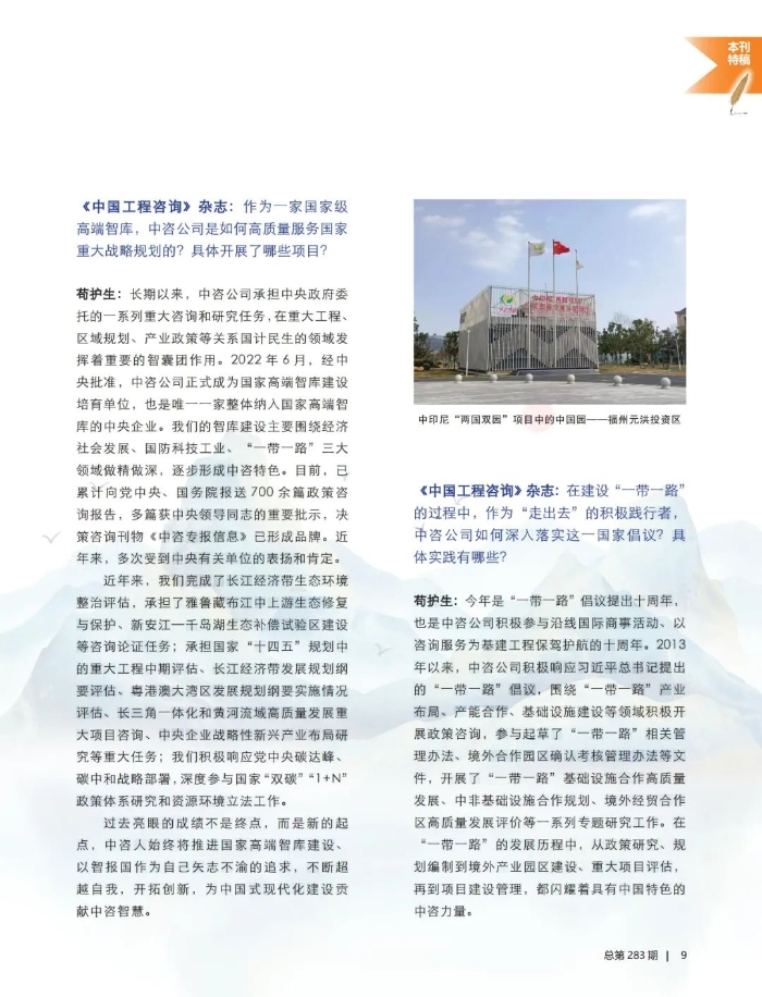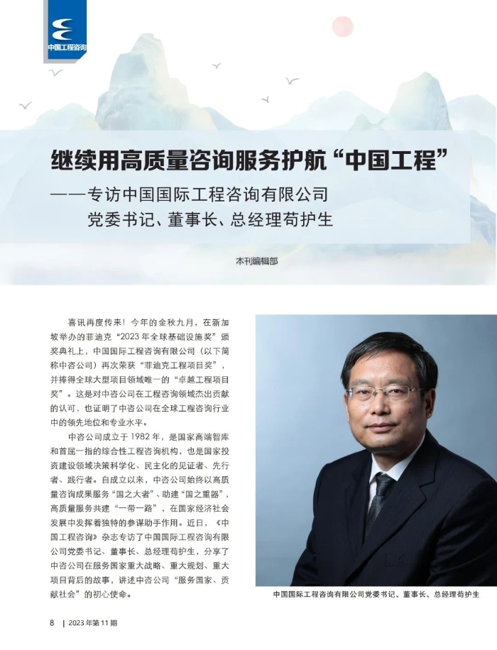 喜訊再度傳來!今年的金秋九月,在新加坡舉辦的菲迪克“2023年全球基礎(chǔ)設(shè)施獎”頒獎典禮上,中國國際工程咨詢有限公司(以下簡稱中咨公司)再次榮獲“菲迪克工程項(xiàng)目獎”,并捧得全球大型項(xiàng)目領(lǐng)域唯一的“卓越工程項(xiàng)目獎”。這是對中咨公司在工程咨詢領(lǐng)域杰出貢獻(xiàn)的認(rèn)可,也證明了中咨公司在全球工程咨詢行業(yè)中的領(lǐng)先地位和專業(yè)水平。 中咨公司成立于1982年,是國家高端智庫和首屈一指的綜合性工程咨詢機(jī)構(gòu),也是國家投資建設(shè)領(lǐng)域決策科學(xué)化、民主化的見證者、先行者、踐行者。自成立以來,中咨公司始終以高質(zhì)量咨詢成果服務(wù)“國之大者”、助建“國之重器”,高質(zhì)量服務(wù)共建“一帶一路”,在國家經(jīng)濟(jì)社會發(fā)展中發(fā)揮著獨(dú)特的參謀助手作用。近日,《中國工程咨詢》雜志專訪了中國國際工程咨詢有限公司黨委書記、董事長、總經(jīng)理茍護(hù)生,分享了中咨公司在服務(wù)國家重大戰(zhàn)略、重大規(guī)劃、重大項(xiàng)目背后的故事,講述中咨公司“服務(wù)國家、貢獻(xiàn)社會”的初心使命。 《中國工程咨詢》雜志:作為一家國家級高端智庫,中咨公司是如何高質(zhì)量服務(wù)國家重大戰(zhàn)略規(guī)劃的?具體開展了哪些項(xiàng)目? 茍護(hù)生:長期以來,中咨公司承擔(dān)中央政府委托的一系列重大咨詢和研究任務(wù),在重大工程、區(qū)域規(guī)劃、產(chǎn)業(yè)政策等關(guān)系國計民生的領(lǐng)域發(fā)揮著重要的智囊團(tuán)作用。2022年6月,經(jīng)中央批準(zhǔn),中咨公司正式成為國家高端智庫建設(shè)培育單位,也是唯一一家整體納入國家高端智庫的中央企業(yè)。我們的智庫建設(shè)主要圍繞經(jīng)濟(jì)社會發(fā)展、國防科技工業(yè)、“一帶一路”三大領(lǐng)域做精做深,逐步形成中咨特色。目前,已累計向黨中央、國務(wù)院報送700余篇政策咨詢報告,多篇獲中央領(lǐng)導(dǎo)同志的重要批示,決策咨詢刊物《中咨專報信息》已形成品牌。近年來,多次受到中央有關(guān)單位的表揚(yáng)和肯定。 近年來,我們完成了長江經(jīng)濟(jì)帶生態(tài)環(huán)境整治評估,承擔(dān)了雅魯藏布江中上游生態(tài)修復(fù)與保護(hù)、新安江—千島湖生態(tài)補(bǔ)償試驗(yàn)區(qū)建設(shè)等咨詢論證任務(wù);承擔(dān)國家“十四五”規(guī)劃中的重大工程中期評估、長江經(jīng)濟(jì)帶發(fā)展規(guī)劃綱要評估、粵港澳大灣區(qū)發(fā)展規(guī)劃綱要實(shí)施情況評估、長三角一體化和黃河流域高質(zhì)量發(fā)展重大項(xiàng)目咨詢、中央企業(yè)戰(zhàn)略性新興產(chǎn)業(yè)布局研究等重大任務(wù);我們積極響應(yīng)黨中央碳達(dá)峰、碳中和戰(zhàn)略部署,深度參與國家“雙碳”“1+N”政策體系研究和資源環(huán)境立法工作。 過去亮眼的成績不是終點(diǎn),而是新的起點(diǎn),中咨人始終將推進(jìn)國家高端智庫建設(shè)、以智報國作為自己矢志不渝的追求,不斷超越自我,開拓創(chuàng)新,為中國式現(xiàn)代化建設(shè)貢獻(xiàn)中咨智慧。 《中國工程咨詢》雜志:在建設(shè)“一帶一路”的過程中,作為“走出去”的積極踐行者,中咨公司如何深入落實(shí)這一國家倡議?具體實(shí)踐有哪些? 茍護(hù)生:今年是“一帶一路”倡議提出十周年,也是中咨公司積極參與沿線國際商事活動、以咨詢服務(wù)為基建工程保駕護(hù)航的十周年。2013年以來,中咨公司積極響應(yīng)習(xí)近平總書記提出的“一帶一路”倡議,圍繞“一帶一路”產(chǎn)業(yè)布局、產(chǎn)能合作、基礎(chǔ)設(shè)施建設(shè)等領(lǐng)域積極開展政策咨詢,參與起草了“一帶一路”相關(guān)管理辦法、境外合作園區(qū)確認(rèn)考核管理辦法等文件,開展了“一帶一路”基礎(chǔ)設(shè)施合作高質(zhì)量發(fā)展、中非基礎(chǔ)設(shè)施合作規(guī)劃、境外經(jīng)貿(mào)合作區(qū)高質(zhì)量發(fā)展評價等一系列專題研究工作。在“一帶一路”的發(fā)展歷程中,從政策研究、規(guī)劃編制到境外產(chǎn)業(yè)園區(qū)建設(shè)、重大項(xiàng)目評估,再到項(xiàng)目建設(shè)管理,都閃耀著具有中國特色的中咨力量。 中咨公司圍繞新時期高水平對外開放,為高質(zhì)量推進(jìn)“一帶一路”建設(shè)提供全方位咨詢服務(wù):承擔(dān)了埃塞北部鐵路、喀麥隆水廠等項(xiàng)目全過程咨詢;完成了玻利維亞煉廠優(yōu)惠貸款項(xiàng)目現(xiàn)場考察和綜合評估;承擔(dān)的援柬埔寨交通領(lǐng)域總體規(guī)劃項(xiàng)目順利完成并移交,得到柬方高度評價;完成了“沙特大陸橋”階段性評估;克服艱難險阻,完成中老鐵路監(jiān)理任務(wù);中老鐵路搬遷安居村項(xiàng)目獲得中國援外項(xiàng)目“優(yōu)良”工程評定;中印尼“兩國雙園”項(xiàng)目為兩國貿(mào)易打造了“一帶一路”經(jīng)貿(mào)往來的大通道、產(chǎn)業(yè)合作的連通器、民心相通的新載體……在共建“一帶一路”的征程上,中咨人的腳步從未停下,從規(guī)劃、評估、咨詢、監(jiān)理到全過程咨詢,每一步都緊跟國家戰(zhàn)略方向。下一個十年里,中咨人將更加奮發(fā)作為,為高質(zhì)量共建人類命運(yùn)共同體作出