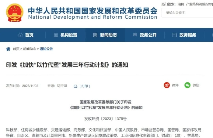 深入踐行“兩山”理念 扎實(shí)推進(jìn)“以竹代塑” 朱黎陽 2022年11月7日,習(xí)近平總書記在致國際竹藤組織成立二十五周年志慶暨第二屆世界竹藤大會賀信上作出“以竹代塑”重要指示,為加強(qiáng)塑料污染全鏈條治理指明了方向。近日,國家發(fā)展改革委等部門印發(fā)了《加快“以竹代塑”發(fā)展三年行動計(jì)劃》(發(fā)改環(huán)資〔2023〕1375號,以下簡稱《行動計(jì)劃》),系統(tǒng)部署了七大重點(diǎn)行動、三大保障措施,并同步發(fā)布了“以竹代塑”主要產(chǎn)品名錄,推動“以竹代塑”高質(zhì)量發(fā)展,助力減少塑料污染。 一、推進(jìn)“以竹代塑”意義重大 推進(jìn)“以竹代塑”是加強(qiáng)塑料污染全鏈條治理的必然要求。從國內(nèi)看,雖然塑料垃圾大規(guī)模泄漏到自然環(huán)境的態(tài)勢得到了有效遏制,但是一次性塑料購物袋、外賣等領(lǐng)域問題仍然存在。從國際看,塑料污染問題受到國際社會廣泛關(guān)注,全球各國都在尋找兼顧環(huán)境治理與經(jīng)濟(jì)發(fā)展的塑料污染治理道路。推進(jìn)“以竹代塑”可以從源頭上減少塑料垃圾的產(chǎn)生,既是國內(nèi)加強(qiáng)塑料污染全鏈條治理的有效途徑,也為全球塑料污染治理提供了解決方案。 推進(jìn)“以竹代塑”是生態(tài)產(chǎn)品價(jià)值實(shí)現(xiàn)的具體舉措。良好生態(tài)環(huán)境是人民群眾的共有財(cái)富,把生態(tài)環(huán)境優(yōu)勢轉(zhuǎn)化為生態(tài)農(nóng)業(yè)、生態(tài)工業(yè)、生態(tài)旅游等生態(tài)經(jīng)濟(jì)優(yōu)勢,綠水青山就變成了金山銀山。“以竹代塑”依托竹子的可再生、可循環(huán)利用的特性,推動傳統(tǒng)生產(chǎn)模式的轉(zhuǎn)變,促進(jìn)竹資源的生態(tài)價(jià)值轉(zhuǎn)換,真正把生態(tài)優(yōu)勢轉(zhuǎn)化為經(jīng)濟(jì)優(yōu)勢。 推進(jìn)“以竹代塑”是實(shí)現(xiàn)碳達(dá)峰碳中和的有力支撐。竹子生長快,固碳能力強(qiáng),是林業(yè)碳匯的重要途徑。以竹木加工而成的竹木產(chǎn)品和建筑物,固碳時(shí)間可達(dá)幾十年、上百年。據(jù)測算,我國竹林每年可實(shí)現(xiàn)減碳1.97億噸、固碳1.05億噸;加工1噸竹材碳排放30千克,分別是鋼材的1/216、鋁材的1/220、水泥的1/41、塑料的1/19。據(jù)測算,若全球每年使用1億噸竹子替代聚氯乙烯產(chǎn)品,預(yù)計(jì)將減少約6億噸二氧化碳排放。 二、《行動計(jì)劃》描繪了“以竹代塑”發(fā)展具體路徑 《行動計(jì)劃》堅(jiān)持系統(tǒng)思維,協(xié)調(diào)推進(jìn)“以竹代塑”。一是協(xié)調(diào)政府和市場發(fā)揮合力,充分發(fā)揮市場配置資源的決定性作用,增強(qiáng)產(chǎn)業(yè)發(fā)展的內(nèi)生動力;更好發(fā)揮政府作用,營造良好的發(fā)展環(huán)境。二是協(xié)調(diào)不同區(qū)域,綜合考慮不同地區(qū)資源稟賦、產(chǎn)業(yè)發(fā)展基礎(chǔ),漸次推進(jìn)。三是協(xié)調(diào)不同應(yīng)用場景,提出要精準(zhǔn)識別替代場景,發(fā)布了“以竹代塑”主要產(chǎn)品名錄,明確了優(yōu)先替代的領(lǐng)域,具有很強(qiáng)的操作性。 《行動計(jì)劃》堅(jiān)持科技創(chuàng)新優(yōu)先。一是組織“以竹代塑”相關(guān)科研攻關(guān),突破一批關(guān)鍵共性技術(shù)及重大裝備。二是強(qiáng)化優(yōu)良種質(zhì)資源選育和定向培育,培育適宜于不同“代塑”產(chǎn)品工業(yè)化生產(chǎn)的新品種。三是加強(qiáng)“以竹代塑”產(chǎn)品深度研發(fā),補(bǔ)齊天然材料性能短板。四是加快研發(fā)先進(jìn)制造裝備,提高竹林采伐、運(yùn)輸、加工環(huán)節(jié)機(jī)械化水平。 《行動計(jì)劃》將綠色發(fā)展理念融入“以竹代塑”全過程。一是注重各領(lǐng)域之間的低碳循環(huán)可持續(xù),強(qiáng)調(diào)著力抓好竹林資源培育、竹材精深加工、產(chǎn)品設(shè)計(jì)制造、市場應(yīng)用拓展等全鏈條全要素環(huán)節(jié)。二是注重培育綠色高效的產(chǎn)業(yè)鏈,鼓勵主要竹產(chǎn)區(qū)因地制宜拓展“原料—加工—產(chǎn)品—營銷”上中下游產(chǎn)業(yè)鏈。三是鼓勵發(fā)展竹產(chǎn)業(yè)循環(huán)經(jīng)濟(jì),推行全竹利用產(chǎn)業(yè)模式,強(qiáng)化竹加工廢棄物循環(huán)利用,推廣應(yīng)用竹材綜合利用技術(shù)裝備。 《行動計(jì)劃》堅(jiān)持開放合作,以國際視野推進(jìn)“以竹代塑”。一是以共建“一帶一路”倡議為引領(lǐng),攜手國際竹藤組織,鼓勵中國企業(yè)走出去,支持竹資源相對豐富的國家發(fā)展“以竹代塑”產(chǎn)業(yè),促進(jìn)國際產(chǎn)能合作。二是依托中國國際消費(fèi)品博覽會等活動,搭建對話交流平臺,推動政企合作和產(chǎn)學(xué)互動。三是在主要竹產(chǎn)區(qū)開展竹產(chǎn)品推廣對接活動,通過發(fā)布產(chǎn)品清單、需求清單、簽訂協(xié)議等方式,引導(dǎo)商貿(mào)流通企業(yè)與竹制品企業(yè)產(chǎn)銷協(xié)同、供需對接。四是在全國選擇竹資源豐富、竹產(chǎn)業(yè)基礎(chǔ)較好的地區(qū),分批建設(shè)“以竹代塑”應(yīng)用推廣基地,示范引領(lǐng)其他地區(qū)有序推進(jìn)。 三、《行動計(jì)劃》的有效落實(shí)需全社會共同發(fā)力 主管部門需分工協(xié)作,加快完善有利于推