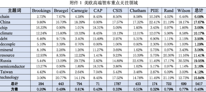 | 一、研究背景 美歐智庫是全球智庫體系中的重要組成部分,其發(fā)展起步較早,發(fā)展模式較好,行業(yè)規(guī)范更成熟,是美歐國家的重要政策智囊,在全球高端輿論體系中有著重要的地位??傮w來看,美歐智庫在數(shù)量和影響力方面處于世界領(lǐng)先地位,其發(fā)布的觀點、分析和評論也成為了當(dāng)下了解美歐國家政府內(nèi)部認(rèn)知和社會公共輿論的一扇重要窗口。 一般對于智庫的研究報告都以文獻(xiàn)閱讀、分析、總結(jié)為主,多針對一篇或幾篇報告進(jìn)行分析。這種研究方式的優(yōu)勢是分析更為透徹和深入,但是由于個人精力、關(guān)注方向的局限性,容易陷入“信息繭房”,對整體方向的把握比較散亂。本報告屬于美歐智庫成果大數(shù)據(jù)研究系列,旨在持續(xù)跟蹤美歐智庫研究動向,更全面了解美歐國家對國際政治、經(jīng)濟貿(mào)易、中國發(fā)展等關(guān)鍵領(lǐng)域的認(rèn)知情況。 二、樣本選取 研究樣本選取美國布魯金斯學(xué)會(Brookings)、美國卡內(nèi)基國際和平基金會(Carnegie)、比利時布魯蓋爾研究所(Bruegel)、美國戰(zhàn)略與國際問題研究中心(CSIS)、英國皇家國際事務(wù)研究所(Chatham)、美國蘭德公司(Rand)、美國彼得森國際經(jīng)濟研究所(PIIE)、威爾遜中心(Wilson)和美國進(jìn)步中心(CAP)等9家智庫。 樣本報告研究覆蓋關(guān)于中國、產(chǎn)業(yè)鏈、芯片、氣候、債務(wù)、脫鉤、礦物、資源、俄羅斯、半導(dǎo)體、臺灣、技術(shù)等相關(guān)領(lǐng)域的研究報告,共計5417篇。 三、文本數(shù)據(jù)分析 (一)各智庫關(guān)注領(lǐng)域 2023上半年,各歐美智庫與中國、俄羅斯等相關(guān)的主題報告占比在五分之二左右,與供應(yīng)鏈、芯片產(chǎn)業(yè)、半導(dǎo)體產(chǎn)業(yè)、礦產(chǎn)產(chǎn)業(yè)、脫鉤等相關(guān)的主題報告占比在五分之一左右,與氣候、資源、債務(wù)等相關(guān)的主題報告占比約五分之一,與臺灣、科技主題相關(guān)的報告約占五分之一。不同主題下智庫關(guān)注的重點領(lǐng)域分析參見附件1。 1.布魯蓋爾:中國和科技 布魯蓋爾研究所注重中國問題和科技前沿產(chǎn)業(yè)的研究。在限制中國科技發(fā)展的問題上,布魯蓋爾指出,越來越多的研究員擔(dān)心美國在基礎(chǔ)研究方面的開放可能過于支持競爭對手。隨著科技水平在一些關(guān)鍵領(lǐng)域取得的重大突破、全球化信息環(huán)境的形成、以及國際經(jīng)濟聯(lián)系的深化和多樣化,各國的相互依存將不可分離,高技術(shù)產(chǎn)業(yè)針對某一國家和地區(qū)進(jìn)行全面封鎖將愈加困難。在科技前沿產(chǎn)業(yè)研究中,布魯蓋爾對由國防部、聯(lián)合作戰(zhàn)指揮部、海軍、海軍陸戰(zhàn)隊、國防機構(gòu)和國防情報部門聯(lián)合資助的蘭德公司國防研究所進(jìn)行了重點分析,認(rèn)為美國應(yīng)繼續(xù)通過軍工聯(lián)合體推進(jìn)前沿科技轉(zhuǎn)化的研究工作。 2.布魯金斯:芯片和資源 布魯金斯學(xué)會的研究領(lǐng)域較為廣泛,其研究相對側(cè)重芯片和資源。布魯金斯認(rèn)為美國利用其在國際組織如多邊開發(fā)銀行中的股權(quán)影響力,支持美國在外交、安全和經(jīng)濟方面的政策和活動,特別是對芯片技術(shù)的封鎖。布魯金斯通過對關(guān)鍵礦產(chǎn)供應(yīng)問題的大量分析,如美國和日本宣布的關(guān)于電池礦物采購、美國對加拿大礦業(yè)項目的融資貿(mào)易協(xié)議,提出應(yīng)加強關(guān)注部分關(guān)鍵產(chǎn)業(yè)供應(yīng)鏈上游礦產(chǎn)品,目前美國部分利益團體已經(jīng)加強該類產(chǎn)品的供應(yīng)安全,對相關(guān)風(fēng)險有所警惕和防范。 3.卡內(nèi)基:中國和俄羅斯 卡內(nèi)基國際和平基金會的研究具有鮮明的特色,以俄羅斯、中國問題為研究重點,相關(guān)報告約占其研究報告總量的一半。針對俄羅斯,卡內(nèi)基提出目前正在美國執(zhí)行的三大舉措包括加強對烏克蘭的戰(zhàn)爭支持、維持對俄羅斯的制裁和加強北約的東部防線,成功搭建了遏制俄羅斯發(fā)展的政策框架,未來應(yīng)立足這三大核心進(jìn)一步強化對俄政策。圍繞烏克蘭提出的《基輔安全協(xié)議保障草案》,美國仍在權(quán)衡是否將目前的支持轉(zhuǎn)化為更持久的框架。卡內(nèi)基提出,美國對烏克蘭的軍事援助已經(jīng)在美國政府內(nèi)部產(chǎn)生爭議,特別是美國總統(tǒng)選舉即將到來的窗口期日益臨近,各個候選人團隊會在這段時間重新研究對烏援助計劃,以爭取選民和國內(nèi)各勢力的最大限度支持。針對中國,卡內(nèi)基多名研究員提出拜登政府的國家安全戰(zhàn)略將中國作為最重要的地緣政治挑戰(zhàn),未來會加強澳大利亞、英國和美國組成的三方安全伙伴關(guān)系,將其逐步培養(yǎng)成印太地區(qū)最強大的軍事力量之一。 4.蘭德:中國、俄羅斯和科技 蘭德公司延續(xù)了其對中國、俄羅斯和科技前沿的關(guān)注。蘭德重點分析和權(quán)衡了中俄戰(zhàn)略地位,雖然短期內(nèi)美國由于烏克蘭戰(zhàn)爭而全面回歸歐洲安全事務(wù),但是長期來看美國的戰(zhàn)略關(guān)注重點仍然是中國。同時,部分研究提出對烏克蘭的援助不僅是對一個主權(quán)國家生存空間的支持,也可以將烏克蘭視為一個潛在的投