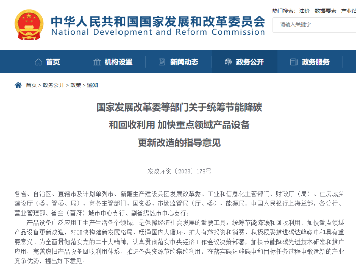 擴大產(chǎn)品設(shè)備更新改造有效需求 推動制造業(yè)高品質(zhì)供給 助力實體經(jīng)濟高質(zhì)量發(fā)展 ——《關(guān)于統(tǒng)籌節(jié)能降碳和回收利用 加快重點領(lǐng)域產(chǎn)品設(shè)備更新改造的指導意見》解讀 中國國際工程咨詢有限公司 潘小海 產(chǎn)品設(shè)備作為日常生產(chǎn)生活中不可或缺的工具,是保障經(jīng)濟社會發(fā)展的重要基礎(chǔ),具有應(yīng)用范圍廣、保有量大、能耗量高、再生資源蘊藏豐富等特點。近日,國家發(fā)展改革委等9部門聯(lián)合印發(fā)了《關(guān)于統(tǒng)籌節(jié)能降碳和回收利用 加快重點領(lǐng)域產(chǎn)品設(shè)備更新改造的指導意見》(發(fā)改環(huán)資〔2023〕178號,以下簡稱《指導意見》),對相關(guān)工作進行部署,明確了總體要求、工作目標和重點任務(wù),有利于暢通國內(nèi)大循環(huán)、加快發(fā)展方式綠色轉(zhuǎn)型、積極穩(wěn)妥推進碳達峰碳中和、助推經(jīng)濟社會高質(zhì)量發(fā)展。 01 加快產(chǎn)品設(shè)備更新改造和回收利用是暢通國內(nèi)大循環(huán)的重要手段 加快構(gòu)建以國內(nèi)大循環(huán)為主體、國內(nèi)國際雙循環(huán)相互促進的新發(fā)展格局,是以習近平同志為核心的黨中央作出的重大戰(zhàn)略決策。去年底召開的中央經(jīng)濟工作會議將著力擴大內(nèi)需放在2023年重點工作任務(wù)首位。近期,習近平總書記在中央政治局第二次集體學習時強調(diào),要搞好統(tǒng)籌擴大內(nèi)需和深化供給側(cè)結(jié)構(gòu)性改革,形成需求牽引供給、供給創(chuàng)造需求的更高水平動態(tài)平衡,實現(xiàn)國民經(jīng)濟良性循環(huán)。 從經(jīng)濟發(fā)展規(guī)律來看,大國經(jīng)濟具有內(nèi)需為主導的顯著特征。我國市場上的產(chǎn)品設(shè)備種類多、應(yīng)用范圍廣,對促進國內(nèi)消費、帶動經(jīng)濟增長具有重要作用,是實施擴大內(nèi)需戰(zhàn)略的重要著力點。僅以家用電器為例,有關(guān)行業(yè)協(xié)會數(shù)據(jù)顯示,我國主要家用電器保有量已超過20億臺,2021年家用電器市場規(guī)模達8811億元,家用電器行業(yè)規(guī)模以上企業(yè)營業(yè)收入1.7萬億元。 《指導意見》首批聚焦鍋爐、電機、電力變壓器、制冷、照明、家用電器等6類產(chǎn)品設(shè)備,多措并舉支持企業(yè)開展更新改造,推動淘汰低效落后產(chǎn)品設(shè)備,加強節(jié)能降碳先進技術(shù)推廣應(yīng)用,完善廢舊產(chǎn)品設(shè)備回收利用體系。相關(guān)舉措有助于發(fā)揮我國超大規(guī)模市場優(yōu)勢,孕育不同領(lǐng)域、不同層次、不同群體對高效節(jié)能產(chǎn)品設(shè)備的有效需求,帶動設(shè)計、生產(chǎn)、應(yīng)用、回收、處置全鏈條發(fā)展,帶動產(chǎn)業(yè)投資,增加就業(yè)崗位,進一步激發(fā)國內(nèi)市場巨大活力。 暢通國內(nèi)大循環(huán)離不開需求側(cè)消費牽引,也需要供給側(cè)提質(zhì)升級。《指導意見》緊緊扭住深化供給側(cè)結(jié)構(gòu)性改革這條主線,提出發(fā)展一批高效節(jié)能產(chǎn)品設(shè)備生產(chǎn)骨干優(yōu)勢企業(yè)及生產(chǎn)制造集聚區(qū),通過強化財政、稅收、金融等政策支持,引導企業(yè)優(yōu)化產(chǎn)品結(jié)構(gòu),提升高效節(jié)能產(chǎn)品設(shè)備市場供給,筑牢產(chǎn)品設(shè)備消費升級基礎(chǔ)。相關(guān)舉措將推動產(chǎn)品設(shè)備供需兩側(cè)有機結(jié)合,以高效節(jié)能產(chǎn)品的消費需求倒逼供給,以高品質(zhì)供給驅(qū)動消費需求,形成供需良性循環(huán)和動態(tài)平衡。 02 加快產(chǎn)品設(shè)備更新改造和回收利用是積極穩(wěn)妥推進碳達峰碳中和的必然選擇 節(jié)能是最直接、最有效、最經(jīng)濟的降碳舉措;循環(huán)經(jīng)濟以“減量化、再利用、資源化”為原則,與節(jié)能降碳具有顯著的協(xié)同效應(yīng);兩者都是實現(xiàn)碳達峰碳中和目標的重要途徑。我國重點領(lǐng)域產(chǎn)品設(shè)備節(jié)能降碳更新改造潛力巨大。以鍋爐為例,截至2021年底,我國各類鍋爐保有量約35萬臺,碳排放量占比較高。據(jù)測算,工業(yè)鍋爐平均運行熱效率提高5個百分點、電站鍋爐平均運行熱效率提高0.5個百分點,可實現(xiàn)年節(jié)能量約3000萬噸標準煤。同時,廢舊產(chǎn)品設(shè)備蘊藏著豐富的鐵、銅、鋁、鉛、鋅等再生金屬資源,是巨大的“城市礦產(chǎn)”,回收利用價值高。 《指導意見》的突出特點,是堅持產(chǎn)品設(shè)備更新改造和回收利用齊頭并進?!吨笇б庖姟仿鋵嵢婀?jié)約戰(zhàn)略,一手抓前端產(chǎn)品設(shè)備更新改造,一手抓后端回收利用體系建設(shè),著力打通生產(chǎn)、使用、更新、淘汰、回收利用全鏈條。相關(guān)舉措將推動節(jié)能降碳從單個環(huán)節(jié)、部分領(lǐng)域轉(zhuǎn)向全流程系統(tǒng)發(fā)力,使資源節(jié)約滲透到產(chǎn)品設(shè)備生產(chǎn)、消費、回收利用的每一個環(huán)節(jié),實現(xiàn)能盡其用、物盡其用,從而為積極穩(wěn)妥推進碳達峰碳中和提供有力支撐。 03 加快產(chǎn)品設(shè)備更新改造和回收利用將為發(fā)展方式綠色轉(zhuǎn)型注入強大動能 一方面,《指導意見》關(guān)注當前,首批聚焦實施條件相對成熟、示范帶動作用較