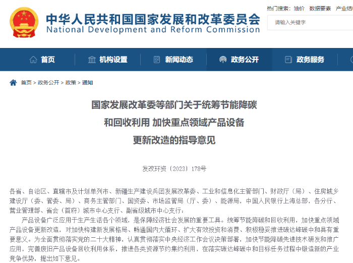 堅(jiān)持系統(tǒng)觀念 著力精準(zhǔn)施策 加快完善廢舊產(chǎn)品設(shè)備回收利用體系 ——《關(guān)于統(tǒng)籌節(jié)能降碳和回收利用 加快重點(diǎn)領(lǐng)域產(chǎn)品設(shè)備更新改造的指導(dǎo)意見(jiàn)》解讀 朱黎陽(yáng) 完善廢舊產(chǎn)品設(shè)備回收利用體系,是貫徹落實(shí)黨的二十大報(bào)告關(guān)于“實(shí)施全面節(jié)約戰(zhàn)略,推進(jìn)各類(lèi)資源節(jié)約集約利用,加快構(gòu)建廢棄物循環(huán)利用體系”的重要舉措。近日,國(guó)家發(fā)展改革委會(huì)同有關(guān)部門(mén)印發(fā)了《關(guān)于統(tǒng)籌節(jié)能降碳和回收利用 加快重點(diǎn)領(lǐng)域產(chǎn)品設(shè)備更新改造的指導(dǎo)意見(jiàn)》(發(fā)改環(huán)資〔2023〕178號(hào),以下簡(jiǎn)稱(chēng)《指導(dǎo)意見(jiàn)》),明確了統(tǒng)籌推進(jìn)產(chǎn)品設(shè)備更新改造和回收利用的目標(biāo)任務(wù)、政策措施和實(shí)施指南,是指導(dǎo)各地區(qū)和有關(guān)行業(yè)企業(yè)做好相關(guān)工作的重要文件。 01 堅(jiān)持系統(tǒng)施策,破解回收難題 當(dāng)前,我國(guó)正處在工業(yè)化和城鎮(zhèn)化深化發(fā)展的關(guān)鍵階段,將迎來(lái)新一輪產(chǎn)品設(shè)備更新升級(jí)高峰。隨著一批高性能、高效率、高質(zhì)量新產(chǎn)品投用,與之相應(yīng)將有一批產(chǎn)品設(shè)備陸續(xù)退役?;厥绽檬钱a(chǎn)品設(shè)備全生命周期中的重要一環(huán),規(guī)范回收是實(shí)現(xiàn)各類(lèi)廢舊產(chǎn)品設(shè)備“物盡其用”的必要前提。如何實(shí)現(xiàn)成批廢舊產(chǎn)品設(shè)備的循環(huán)利用是擺在各方面前的現(xiàn)實(shí)問(wèn)題。 《指導(dǎo)意見(jiàn)》堅(jiān)持系統(tǒng)觀念,順應(yīng)產(chǎn)業(yè)發(fā)展趨勢(shì)和特點(diǎn),精準(zhǔn)把握產(chǎn)業(yè)發(fā)展需求,以“規(guī)范化、規(guī)模化、精細(xì)化”為導(dǎo)向,結(jié)合產(chǎn)品設(shè)備更新潛力、廢舊設(shè)備利用途徑等,從產(chǎn)品設(shè)備更新改造到回收、拆解、利用等各個(gè)環(huán)節(jié),系統(tǒng)性提出完善回收利用體系的細(xì)化要求,強(qiáng)化資金、政策、標(biāo)準(zhǔn)、技術(shù)、監(jiān)管等全方位支撐保障,具有較強(qiáng)的指導(dǎo)性和可操作性。加快完善廢舊產(chǎn)品設(shè)備回收利用體系,補(bǔ)齊廢舊產(chǎn)品設(shè)備循環(huán)利用產(chǎn)業(yè)鏈短板,對(duì)提升廢棄物循環(huán)利用水平和協(xié)同推進(jìn)降碳、減污、擴(kuò)綠、增長(zhǎng)具有重要意義。 02 堅(jiān)持依法依規(guī),強(qiáng)化規(guī)范回收 “規(guī)范化”是完善廢舊產(chǎn)品設(shè)備回收利用的第一優(yōu)先導(dǎo)向?!吨笇?dǎo)意見(jiàn)》強(qiáng)調(diào),要尊重客觀規(guī)律,堅(jiān)守安全底線,堅(jiān)持依法依規(guī),規(guī)范開(kāi)展廢舊產(chǎn)品設(shè)備回收處置,并細(xì)化提出相關(guān)要求。 一是規(guī)范處置國(guó)有資產(chǎn)。要落實(shí)國(guó)務(wù)院國(guó)資委《關(guān)于企業(yè)國(guó)有資產(chǎn)交易流轉(zhuǎn)有關(guān)事項(xiàng)的通知》要求,完善國(guó)有廢舊產(chǎn)品設(shè)備資產(chǎn)處置制度,推動(dòng)企業(yè)高效、規(guī)范處置相關(guān)資產(chǎn)。二是規(guī)范開(kāi)展回收經(jīng)營(yíng)活動(dòng)。相關(guān)企業(yè)要按照《再生資源回收管理辦法》有關(guān)要求,進(jìn)行再生資源回收經(jīng)營(yíng)者備案等。三是依法依規(guī)開(kāi)展報(bào)廢處置。相關(guān)主體應(yīng)嚴(yán)格落實(shí)法律法規(guī)和標(biāo)準(zhǔn)要求,規(guī)范處置屬于強(qiáng)制淘汰、存在嚴(yán)重事故隱患、無(wú)改造維修價(jià)值的報(bào)廢產(chǎn)品設(shè)備,杜絕通過(guò)二手交易等方式重新流入市場(chǎng)。四是嚴(yán)格遵守生態(tài)環(huán)境保護(hù)相關(guān)法律法規(guī)和標(biāo)準(zhǔn)要求。比如,涉及處置含油變壓器的,應(yīng)有廢油回收儲(chǔ)存設(shè)備和相關(guān)處理措施;從事制冷劑回收利用等經(jīng)營(yíng)活動(dòng)的,應(yīng)嚴(yán)格落實(shí)《消耗臭氧層物質(zhì)管理?xiàng)l例》有關(guān)要求;從事屬于危險(xiǎn)廢物的含汞廢舊照明設(shè)備回收利用經(jīng)營(yíng)活動(dòng)的,應(yīng)具有危險(xiǎn)廢物經(jīng)營(yíng)許可證等。 03 堅(jiān)持多方聯(lián)動(dòng),力爭(zhēng)應(yīng)收盡收 退役產(chǎn)品設(shè)備的型號(hào)多、數(shù)量大、分布廣,涉及各地區(qū)、各行業(yè)、各領(lǐng)域。以往在實(shí)踐中,一些退役產(chǎn)品設(shè)備存在規(guī)范回收利用比例較低、長(zhǎng)期閑置、進(jìn)入不規(guī)范拆解處置渠道等問(wèn)題。為統(tǒng)籌推進(jìn)產(chǎn)品設(shè)備更新改造和回收利用,《指導(dǎo)意見(jiàn)》堅(jiān)持問(wèn)題導(dǎo)向,精準(zhǔn)施策,有針對(duì)性地提出了實(shí)現(xiàn)“規(guī)?;被厥盏娜舾膳e措。 一是加強(qiáng)信息共享。要求各地按照市場(chǎng)化法治化原則,組織開(kāi)展廢舊產(chǎn)品設(shè)備回收處置供需對(duì)接,打破回收利用的信息壁壘。二是探索新型回收模式。支持發(fā)展廢舊產(chǎn)品設(shè)備回收、運(yùn)輸、拆解、利用一體化模式。同時(shí)發(fā)揮制度和體制優(yōu)勢(shì),支