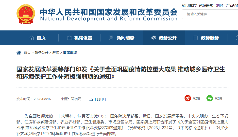 | 統(tǒng)籌謀劃 重點(diǎn)突破 加快補(bǔ)齊城鄉(xiāng)醫(yī)療衛(wèi)生和環(huán)境保護(hù)短板弱項 ——《關(guān)于全面鞏固疫情防控重大成果 推動城鄉(xiāng)醫(yī)療衛(wèi)生和環(huán)境保護(hù)工作補(bǔ)短板強(qiáng)弱項的通知》解讀 中國國際工程咨詢有限公司 潘小海 全面鞏固疫情防控重大成果,加強(qiáng)醫(yī)療衛(wèi)生和環(huán)境保護(hù)工作是最大程度保護(hù)人民生命安全和身體健康,最大限度減少疫情對經(jīng)濟(jì)社會發(fā)展的影響,推動經(jīng)濟(jì)平穩(wěn)健康發(fā)展的重要舉措。近日,國家發(fā)展改革委、中央文明辦、生態(tài)環(huán)境部、住房和城鄉(xiāng)建設(shè)部、農(nóng)業(yè)農(nóng)村部、國家衛(wèi)生健康委、市場監(jiān)管總局、國家疾控局聯(lián)合印發(fā)《關(guān)于全面鞏固疫情防控重大成果 推動城鄉(xiāng)醫(yī)療衛(wèi)生和環(huán)境保護(hù)工作補(bǔ)短板強(qiáng)弱項的通知》(發(fā)改環(huán)資〔2023〕224號,以下簡稱《通知》),對全面鞏固疫情防控重大成果,加快補(bǔ)齊城鄉(xiāng)醫(yī)療衛(wèi)生和環(huán)境保護(hù)短板弱項作出系統(tǒng)部署?!锻ㄖ肥锹鋵嶞h的二十大精神的具體舉措,對推動城鄉(xiāng)醫(yī)療衛(wèi)生和環(huán)境保護(hù)工作取得更大進(jìn)展,加快建設(shè)健康中國、美麗中國具有重要意義。 一、充分認(rèn)識鞏固疫情防控重大成果,加快補(bǔ)齊城鄉(xiāng)醫(yī)療衛(wèi)生和環(huán)境保護(hù)短板弱項的重要意義 (一)充分認(rèn)識這是做好新階段疫情防控的迫切需要。3年多來,以習(xí)近平同志為核心的黨中央團(tuán)結(jié)帶領(lǐng)全黨全國各族人民同心抗疫,以強(qiáng)烈的歷史擔(dān)當(dāng)和強(qiáng)大的戰(zhàn)略定力,因時因勢優(yōu)化調(diào)整防控政策措施,高效統(tǒng)籌疫情防控和經(jīng)濟(jì)社會發(fā)展,取得疫情防控重大決定性勝利。當(dāng)前全國疫情防控形勢總體向好,平穩(wěn)進(jìn)入“乙類乙管”常態(tài)化防控階段,但全球疫情仍在流行,病毒還在不斷變異,全面鞏固疫情防控重大成果,加強(qiáng)疫情監(jiān)測和常態(tài)化預(yù)警處置能力建設(shè),加強(qiáng)重點(diǎn)人群健康監(jiān)測設(shè)施和能力,抓緊補(bǔ)齊重點(diǎn)環(huán)節(jié)防控設(shè)施短板,是新階段抓實抓細(xì)疫情防控工作的具體舉措,是做好新階段疫情防控工作的迫切需要。 (二)充分認(rèn)識這是保障人民群眾生命健康的重要舉措。3年以來,在病毒猖獗時期,我國頂住了一輪又一輪疫情沖擊,成功避免了致病力較強(qiáng)、致死率較高的病毒株的廣泛流行,最大程度降低了新冠病毒感染造成的重癥率和病亡率,有效保護(hù)了人民群眾生命安全和身體健康。但同時,疫情防控中我國也暴露出重癥救治壓力大、社區(qū)醫(yī)院分流能力有待加強(qiáng)、重點(diǎn)人群及農(nóng)村地區(qū)救治任務(wù)艱巨等問題。要加快補(bǔ)齊醫(yī)療衛(wèi)生短板弱項,建強(qiáng)醫(yī)療衛(wèi)生服務(wù)網(wǎng)絡(luò)設(shè)施,強(qiáng)化醫(yī)療集團(tuán)網(wǎng)絡(luò)化布局管理機(jī)制,加強(qiáng)醫(yī)療物資資源統(tǒng)籌調(diào)配能力建設(shè),做到醫(yī)療衛(wèi)生服務(wù)資源跟得上、機(jī)制可聯(lián)動,平急結(jié)合、系統(tǒng)高效,切實維護(hù)人民群眾健康福祉。 (三)充分認(rèn)識這是共謀綠色生活共建美麗家園的重要途徑。良好生態(tài)環(huán)境是最普惠的民生福祉,是人民群眾迫切需要的公共產(chǎn)品。黨的十八大以來,以習(xí)近平同志為核心的黨中央把生態(tài)文明建設(shè)擺在全局突出位置,開展一系列根本性、開創(chuàng)性、長遠(yuǎn)性工作,我國生態(tài)環(huán)境質(zhì)量改善成效顯著,人民群眾獲得感幸福感安全感明顯增強(qiáng)。但同時,我國生態(tài)環(huán)境保護(hù)結(jié)構(gòu)性、根源性、趨勢性壓力整體尚未緩解,與人民群眾日常生活息息相關(guān)的城鄉(xiāng)環(huán)境衛(wèi)生、污水垃圾等環(huán)境基礎(chǔ)設(shè)施建設(shè)還存在短板,全社會綠色健康生活方式尚未廣泛形成。要深入開展愛國衛(wèi)生運(yùn)動,補(bǔ)齊人民群眾身邊的污水垃圾等環(huán)境基礎(chǔ)設(shè)施短板,提升全民綠色健康意識,推動共謀綠色生活共建美麗家園。 二、準(zhǔn)確把握全面鞏固疫情防控重大成果,加快補(bǔ)齊城鄉(xiāng)醫(yī)療衛(wèi)生和環(huán)境保護(hù)短板弱項的重點(diǎn)任務(wù) 《通知》堅持統(tǒng)籌推進(jìn)、重點(diǎn)突破,聚焦我國疫情防控過程中暴露出的城鄉(xiāng)醫(yī)療衛(wèi)生和環(huán)境保護(hù)工作短板弱項,以能力建設(shè)為主線,從堅決鞏固住來之不易的疫情防控重大成果、深入開展愛國衛(wèi)生運(yùn)動、加快完善環(huán)境基礎(chǔ)設(shè)施、大力倡導(dǎo)綠色健康生活方式等方面提出12項重點(diǎn)任務(wù),為城鄉(xiāng)醫(yī)療衛(wèi)生和環(huán)境保護(hù)工作補(bǔ)短板強(qiáng)弱項提供了行動指引。 (一)突出能力建設(shè)。一是在鞏固疫情防控成果方面,《通知》提出要加強(qiáng)重點(diǎn)機(jī)構(gòu)和大型場所人員的健康監(jiān)測設(shè)施和能力、醫(yī)療衛(wèi)生服務(wù)能力、醫(yī)療物資資源統(tǒng)籌調(diào)配能力以及動態(tài)監(jiān)測醫(yī)療資源使用