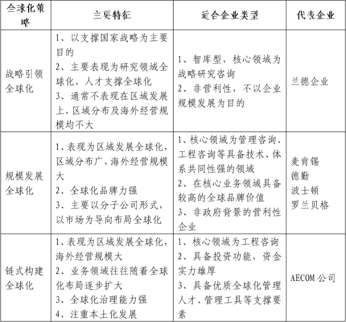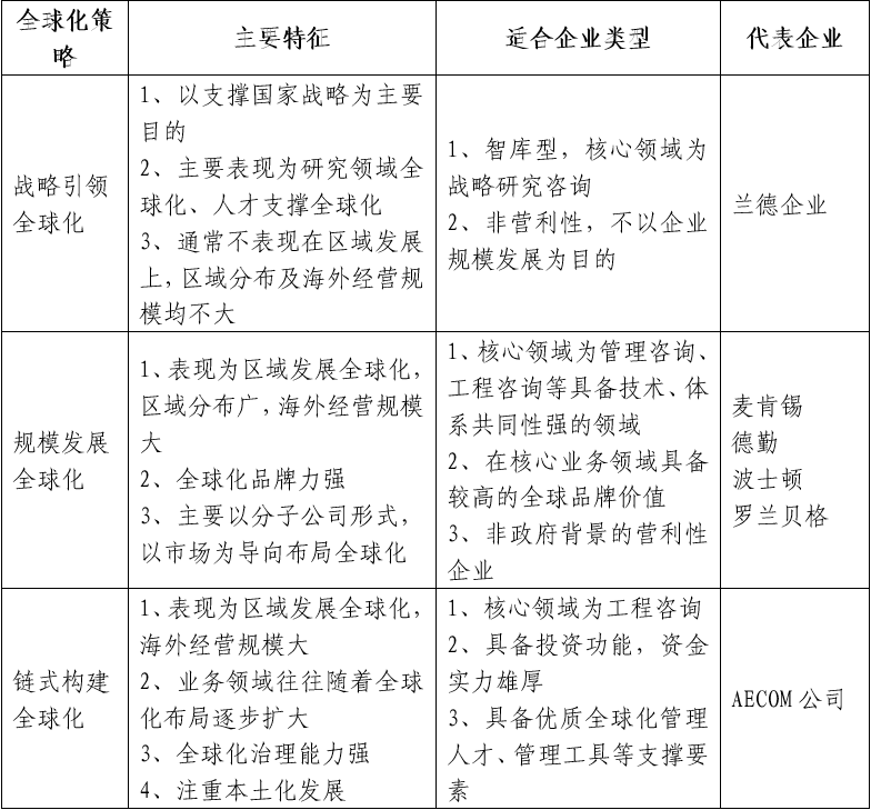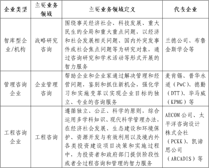 | 中咨公司與世界一流咨詢企業(yè)對(duì)比研究 中咨公司“青馬工程”第四小組 陳佳鵬 譚瀟 王晶晶 等 一、研究背景 (一)研究目的 黨的二十大報(bào)告提出,要“深化國(guó)資國(guó)企改革,加快國(guó)有經(jīng)濟(jì)布局優(yōu)化和結(jié)構(gòu)調(diào)整,推動(dòng)國(guó)有資本和國(guó)有企業(yè)做強(qiáng)做優(yōu)做大,提升企業(yè)核心競(jìng)爭(zhēng)力”“完善中國(guó)特色現(xiàn)代企業(yè)制度,弘揚(yáng)企業(yè)家精神,加快建設(shè)世界一流企業(yè)”,這些都為國(guó)資國(guó)企以實(shí)際行動(dòng)全面建設(shè)社會(huì)主義現(xiàn)代化國(guó)家、以中國(guó)式現(xiàn)代化推進(jìn)中華民族偉大復(fù)興提供了根本遵循。 《國(guó)企改革三年行動(dòng)方案(2020-2022年)》和《關(guān)于開(kāi)展對(duì)標(biāo)世界一流管理提升行動(dòng)的通知》(國(guó)資發(fā)改革〔2020〕39號(hào)),要求中央企業(yè)要對(duì)標(biāo)世界一流企業(yè),通過(guò)管理提升,建設(shè)成為具有全球競(jìng)爭(zhēng)力的企業(yè)。中國(guó)國(guó)際工程咨詢有限公司(以下簡(jiǎn)稱(chēng)中咨公司)“十四五”規(guī)劃明確提出,未來(lái)發(fā)展要聚焦于實(shí)現(xiàn)建成國(guó)家高端智庫(kù)和世界一流咨詢機(jī)構(gòu)的戰(zhàn)略目標(biāo),指明了公司的前進(jìn)方向。 為深入貫徹黨的二十大報(bào)告關(guān)于國(guó)資國(guó)企改革發(fā)展和黨的建設(shè)的重大部署,認(rèn)真落實(shí)國(guó)務(wù)院國(guó)資委關(guān)于中央企業(yè)對(duì)標(biāo)世界一流管理提升改革行動(dòng)計(jì)劃的相關(guān)部署和中咨公司“十四五”發(fā)展規(guī)劃,以推動(dòng)公司高質(zhì)量發(fā)展為主題,以改革創(chuàng)新為根本動(dòng)力,緊扣“加快建設(shè)世界一流咨詢機(jī)構(gòu)”目標(biāo),通過(guò)選取咨詢領(lǐng)域有較強(qiáng)影響力的標(biāo)桿企業(yè)開(kāi)展對(duì)比研究,提出中咨公司建設(shè)世界一流咨詢機(jī)構(gòu)的戰(zhàn)略構(gòu)想,進(jìn)一步搶抓高質(zhì)量發(fā)展的重要戰(zhàn)略機(jī)遇期。 (二)對(duì)比范圍 基于中咨公司業(yè)務(wù)范圍與自身戰(zhàn)略規(guī)劃,本次研究將重點(diǎn)選取全球領(lǐng)先的智庫(kù)型企業(yè)、管理咨詢企業(yè)、工程咨詢企業(yè)進(jìn)行對(duì)比研究。 表1 三類(lèi)咨詢企業(yè)分類(lèi)一覽表