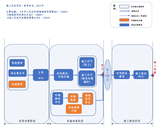 圖1 海上風(fēng)電項目專項手續(xù)要點及與其他事項的關(guān)聯(lián)(2017年) 根據(jù)《中華人民共和國海域使用管理法》(2002)以及《海域使用權(quán)登記辦法》(2006),國務(wù)院或國務(wù)院投資主管部門審批、核準(zhǔn)的建設(shè)項目需要使用海域的,申請人應(yīng)當(dāng)在項目審批、核準(zhǔn)前向國家海洋行政主管部門提出海域使用申請,取得用海預(yù)審意見。在項目實施準(zhǔn)備階段,海域使用申請經(jīng)批準(zhǔn)后,由審核機關(guān)作出項目用海批復(fù)。海域使用申請人應(yīng)當(dāng)按項目用海批復(fù)要求辦理海域使用權(quán)登記,領(lǐng)取海域使用權(quán)證書。海域使用權(quán)證書是海域使用權(quán)的法律憑證。 以海上風(fēng)電項目為例,總結(jié)以2017年為參考時點的海域使用相關(guān)手續(xù)(如圖1所示)。需要強調(diào)的是,本流程圖以用海預(yù)審、用海批復(fù)、海域使用等手續(xù)為主線,主要為了闡明辦理該領(lǐng)域用海方面項目前期工作手續(xù)的意義,以及與相關(guān)要件最緊要相關(guān)的其他工作手續(xù)事項,其他項目前期工作手續(xù)有省略。 根據(jù)2016年國家能源局、國家海洋局聯(lián)合印發(fā)的《海上風(fēng)電開發(fā)建設(shè)管理辦法》(國能新能〔2016〕394號),海上風(fēng)電項目前期涉及的海域使用相關(guān)工作及要點有: 其一,項目單位向省級及以下能源主管部門申請核準(zhǔn)前,應(yīng)向海洋行政主管部門提出用海預(yù)審申請,按規(guī)定程序和要求審查后,由海洋行政主管部門出具項目用海預(yù)審意見。 其二,海上風(fēng)電項目核準(zhǔn)后,項目單位應(yīng)按照程序及時向海洋行政主管部門提出海域使用申請,依法取得海域使用權(quán)后方可開工建設(shè)。 其三,項目開工前,還應(yīng)落實有關(guān)利益協(xié)調(diào)解決方案或協(xié)議,完成通航安全、接入系統(tǒng)等相關(guān)專題的論證工作,并依法取得相應(yīng)主管部門的批復(fù)文件。 其四,項目單位在提出海域使用權(quán)申請前,應(yīng)當(dāng)委托有相應(yīng)資質(zhì)的機構(gòu)編制海上風(fēng)電項目環(huán)境影響報告書,報海洋行政主管部門審查批準(zhǔn)。 其五,海上風(fēng)電項目建成后,按規(guī)定程序申請環(huán)境保護設(shè)施竣工驗收,驗收合格后,該項目方可正式投入運營。 附:特定行業(yè)領(lǐng)域?qū)m検掷m(xù)的主要政策清單(按文中出現(xiàn)先后順序) 1.國務(wù)院《關(guān)于印發(fā)清理規(guī)范投資項目報建審批事項實施方案的通知》(國發(fā)〔2016〕29號) 2.《中華人民共和國海域使用管理法》(2001年)(主席令第61號) 3.國家海洋局《海域使用申請審批暫行辦法》(國海發(fā)〔2002〕5號) 4.國家海洋局《海域使用權(quán)登記辦法》(國海發(fā)〔2002〕23號) 5.國家海洋局《海域使用權(quán)管理規(guī)定》(國海發(fā)〔2006〕27號 ) 6.國家海洋局《海域使用權(quán)登記辦法》(國海發(fā)〔2006〕28號) 7.《中華人民共和國物權(quán)法》(2007年)(主席令第62號) 8.國家海洋局《關(guān)于開展海域使用權(quán)管理統(tǒng)一配號有關(guān)事項的通知》(國海管字〔2017〕81號) 9.國家海洋局《關(guān)于海域、無居民海島有償使用的意見》(2018年) 10.自然資源部《關(guān)于實施海砂采礦權(quán)和海域使用權(quán)“兩權(quán)合一”招拍掛出讓的通知》(自然資規(guī)〔2019〕5號) 11.中共中央《深化黨和國家機構(gòu)改革方案》(2018年) 12.國務(wù)院《國務(wù)院關(guān)于取消和下放一批行政許可事項的決定》(國發(fā)〔2019〕6號) 13.國務(wù)院《中華人民共和國電信條例》(2000年)(國務(wù)院令第291號) 14.信息產(chǎn)業(yè)部《電信業(yè)務(wù)經(jīng)營許可證管理辦法》(2001年)(信息產(chǎn)業(yè)部令第19號) 15.工業(yè)和信息化部《電信業(yè)務(wù)經(jīng)營許可管理辦法》(2009年)(工業(yè)和信息化部令第5號) 16.工業(yè)和信息化部《電信業(yè)務(wù)經(jīng)營許可管理辦法》(2017年)(工業(yè)和信息化部令第42號) 17.國務(wù)院《中華人民共和國電信條例》(2014年)(國務(wù)院令第653號) 18.國務(wù)院《中華人民共和國電信條例》(2016年)(國務(wù)院令第666號) 19.國務(wù)院《關(guān)于取消和下放一批行政審批項目的決定》(國發(fā)〔2014〕5號) 20.國務(wù)院《關(guān)于印發(fā)注冊資本登記制度改革方案的通知》(國發(fā)〔2014〕7號) 21.國務(wù)院《關(guān)于“先照后證”改革后加強事中事后監(jiān)管的意見》(國發(fā)〔2015〕62號) 22. 《中華人民共和國外商投資法》(2019年)(主席令第26號) 23. 國務(wù)院《中華人民共和國外商投資法實施條例》(2019年)(國務(wù)院令第723號) 24. 國家發(fā)展改革委、商務(wù)部《外商投資安全審查辦法》(2020年)(國家發(fā)展改革委商務(wù)部令第37號) 25. 國家能源局、國家海洋局《海上風(fēng)電開發(fā)建設(shè)管理辦法》(國能新能〔2016〕394號) | |||||