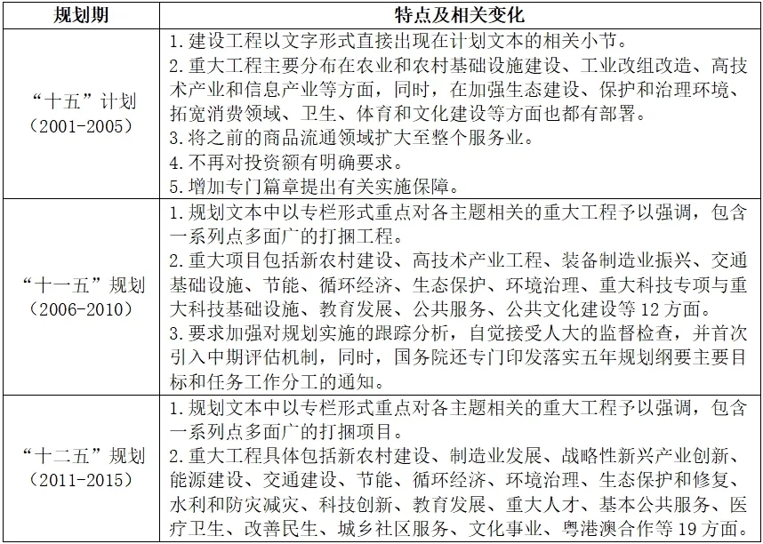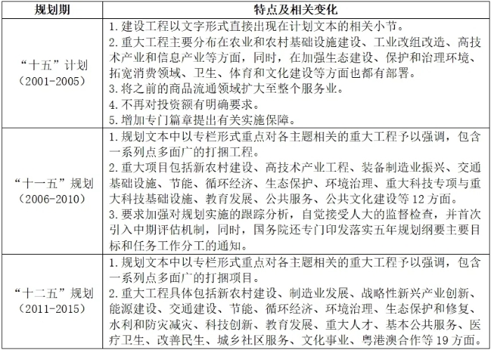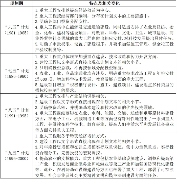 五年規(guī)劃(計(jì)劃)文本中重大工程的歷史回顧 李欣玨 曹玫 習(xí)近平總書記指出,編制和實(shí)施國民經(jīng)濟(jì)和社會(huì)發(fā)展五年規(guī)劃,是我們黨治國理政的重要方式。重大工程作為五年規(guī)劃(計(jì)劃)中的核心內(nèi)容,承載著實(shí)現(xiàn)國家戰(zhàn)略目標(biāo)的重要使命,也是衡量和體現(xiàn)國家綜合實(shí)力和發(fā)展水平的重要標(biāo)志。新中國成立以來,我國共編制和實(shí)施了14個(gè)五年規(guī)劃(計(jì)劃)。從“一五”計(jì)劃到“十四五”規(guī)劃,每一個(gè)五年規(guī)劃(計(jì)劃),國家都要確定百余項(xiàng)重大工程項(xiàng)目作為帶動(dòng)經(jīng)濟(jì)社會(huì)發(fā)展的火車頭。14個(gè)五年規(guī)劃(計(jì)劃)確定的約兩千項(xiàng)重大工程項(xiàng)目,記錄著七十余年非凡成就背后的艱辛和輝煌。以五年規(guī)劃(計(jì)劃)為引領(lǐng),以重大工程項(xiàng)目為牽引,我國經(jīng)濟(jì)社會(huì)發(fā)展取得了全方位、開創(chuàng)性歷史成就,發(fā)生了深層次、根本性歷史變革,為建設(shè)社會(huì)主義現(xiàn)代化國家奠定了堅(jiān)實(shí)基礎(chǔ)。即將迎來的“十五五”時(shí)期是我國承上啟下的重要時(shí)期,是2035年基本實(shí)現(xiàn)社會(huì)主義現(xiàn)代化的關(guān)鍵階段,也是七大深化改革任務(wù)的完成期,更是應(yīng)對復(fù)雜安全威脅的高危期,在“十五五”規(guī)劃中接續(xù)謀劃一批計(jì)長遠(yuǎn)、促發(fā)展、利民生的重大工程項(xiàng)目意義重大。 作為國內(nèi)規(guī)模最大的綜合性工程咨詢機(jī)構(gòu)和中央政府在投資建設(shè)領(lǐng)域的重要咨詢單位,自1982年成立以來,中國國際工程咨詢有限公司承擔(dān)了我國幾乎所有重大工程項(xiàng)目的咨詢評估任務(wù),深切感受到重大工程項(xiàng)目在現(xiàn)代化強(qiáng)國建設(shè)中發(fā)揮的重要作用。本文從歷史維度出發(fā),從計(jì)劃經(jīng)濟(jì)時(shí)期、計(jì)劃經(jīng)濟(jì)體制向社會(huì)主義市場經(jīng)濟(jì)體制轉(zhuǎn)軌時(shí)期、社會(huì)主義市場經(jīng)濟(jì)體制基本建立時(shí)期、社會(huì)主義市場經(jīng)濟(jì)體制完善時(shí)期等四個(gè)階段,對歷次五年規(guī)劃(計(jì)劃)文本中重大工程的特點(diǎn)及變化進(jìn)行系統(tǒng)回顧。 一、計(jì)劃經(jīng)濟(jì)體制時(shí)期(“一五”至“五五”) 有計(jì)劃地發(fā)展國民經(jīng)濟(jì),是新中國成立后的既定方針。為迅速恢復(fù)國民經(jīng)濟(jì)并推進(jìn)工業(yè)化進(jìn)程,借鑒前蘇聯(lián)經(jīng)驗(yàn),我國從1953年開始實(shí)施第一個(gè)五年計(jì)劃?!耙晃濉庇?jì)劃的基本任務(wù)是集中主要力量進(jìn)行以前蘇聯(lián)幫助中國設(shè)計(jì)的156個(gè)建設(shè)單位為中心的、由限額以上的694個(gè)建設(shè)單位組成的工業(yè)建設(shè),建立我國社會(huì)主義工業(yè)化的初步基礎(chǔ)。這一時(shí)期,重大工程項(xiàng)目主要集中在工業(yè)領(lǐng)域,項(xiàng)目涵蓋鋼鐵、煤炭、電力、機(jī)械、化工等多個(gè)行業(yè)。在第一屆全國人民代表大會(huì)第二次會(huì)議審議通過的《關(guān)于發(fā)展國民經(jīng)濟(jì)的第一個(gè)五年計(jì)劃的報(bào)告》中,各領(lǐng)域重大工程以文字形式體現(xiàn),一般出現(xiàn)在措施、要求、布局、任務(wù)等小節(jié),包括建設(shè)或改建長春第一汽車廠、鞍山鋼鐵聯(lián)合企業(yè)、沈陽第一機(jī)床廠等生產(chǎn)性企業(yè),以及建設(shè)武漢長江大橋、青藏鐵路、康藏公路等大型單體項(xiàng)目等。此外,還在計(jì)劃中明確了各行業(yè)領(lǐng)域的投資額度分配和生產(chǎn)性單位的產(chǎn)能目標(biāo),計(jì)劃性特點(diǎn)較為突出。此后,一大批舊中國沒有的基礎(chǔ)工業(yè)部門開始逐步建立,第一批國產(chǎn)汽車出廠、第一架國產(chǎn)飛機(jī)試飛、第一座原子反應(yīng)堆投入運(yùn)轉(zhuǎn)。第一個(gè)五年計(jì)劃的實(shí)施奠定了新中國的工業(yè)化基礎(chǔ)。 表1 “一五”計(jì)劃中的156個(gè)重點(diǎn)項(xiàng)目 注:作者根據(jù)《第一個(gè)五年計(jì)劃(1953—1957)》等公開資料整理。 隨后,“二五”至“五五”計(jì)劃時(shí)期,國家相關(guān)部門未正式印發(fā)計(jì)劃文本。在此期間,雖受到“大躍進(jìn)”“文化大革命”等政治運(yùn)動(dòng)的干擾和影響,國家仍集中力量推進(jìn)了一批重大工程項(xiàng)目,如“兩彈一星”、南京長江大橋、成昆鐵路、劉家峽水電站和大慶油田等,這些項(xiàng)目在科技創(chuàng)新、基礎(chǔ)設(shè)施建設(shè)等方面取得了顯著成就?!耙晃濉钡健拔逦濉保瑑H用5個(gè)五年計(jì)劃的時(shí)間,我國基本形成了獨(dú)立的、比較完整的工業(yè)體系和國民經(jīng)濟(jì)體系,為開展社會(huì)主義建設(shè)積累了經(jīng)驗(yàn)。 二、計(jì)劃經(jīng)濟(jì)體制向社會(huì)主義市場經(jīng)濟(jì)體制轉(zhuǎn)軌時(shí)期(“六五”至“九五”) 改革開放后,我國逐步從計(jì)劃經(jīng)濟(jì)體制向社會(huì)主義市場經(jīng)濟(jì)體制轉(zhuǎn)軌。這一階段的五年計(jì)劃在繼續(xù)強(qiáng)調(diào)經(jīng)濟(jì)發(fā)展的同時(shí),開始注重社會(huì)事業(yè)的協(xié)調(diào)發(fā)展,表明在發(fā)展戰(zh