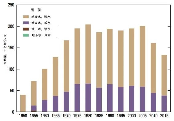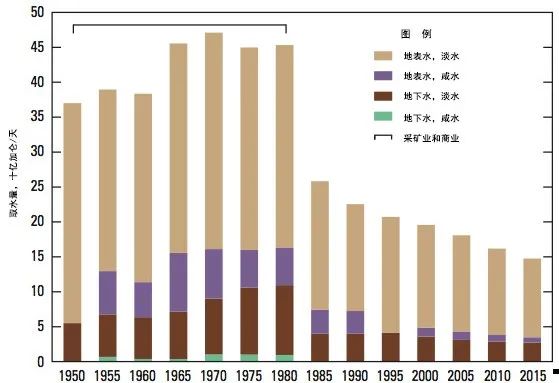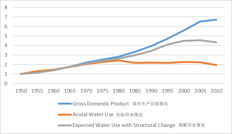 編者按:《2021年聯(lián)合國(guó)世界水發(fā)展報(bào)告》提出,全球新水使用量在過(guò)去100年中增加了6倍,自20世紀(jì)80年代以來(lái)以每年約1%的速度增加。預(yù)計(jì)至2050年全球用水量仍將以類似的速度繼續(xù)增長(zhǎng),且增長(zhǎng)主要集中在中低收入國(guó)家,尤其是新興經(jīng)濟(jì)體[1]。 為進(jìn)一步把握好我國(guó)水資源未來(lái)需求趨勢(shì),我們深入分析研究了一些典型國(guó)家的用水態(tài)勢(shì)變化情況及水資源管理經(jīng)驗(yàn),以期為我國(guó)做好水資源需求研判以及科學(xué)指導(dǎo)水工程規(guī)劃建設(shè)提供參考。本公眾號(hào)將研究成果以系列文章的方式陸續(xù)刊發(fā),本文為系列研究之一,供業(yè)界同仁參考。 美國(guó)用水變化態(tài)勢(shì)對(duì)我國(guó)的啟示 姜富華 邢智慧 紀(jì)興華 一、1950年以來(lái)美國(guó)用水量變化態(tài)勢(shì)分析 (一)1950年以來(lái)美國(guó)用水量變化情況 2015年美國(guó)總用水量約為4449億立方米,其中淡水約為3883億立方米,占比為87%;咸水約為566億立方米,占比為13%。 從1950年至2015年間美國(guó)總用水量的變化情況看,其總體呈先增后降的態(tài)勢(shì)(見圖1)。以1980年為轉(zhuǎn)折點(diǎn),1950-1980年間美國(guó)總用水量隨著人口和經(jīng)濟(jì)的增長(zhǎng)持續(xù)增長(zhǎng),1980年美國(guó)總用水量約為1950年的2.4倍;1980年以后,受產(chǎn)業(yè)結(jié)構(gòu)調(diào)整、技術(shù)進(jìn)步、用水效率提高等因素綜合影響,美國(guó)總用水量呈現(xiàn)了總體下降的態(tài)勢(shì),2015年總用水量比用水高峰的1980年減少了約25%。 美國(guó)淡水取用量與總用水量變化態(tài)勢(shì)一致(見圖2)。1980-2015年間美國(guó)淡水總用水量下降了27%,此期間美國(guó)人口增長(zhǎng)了約42%,GDP增長(zhǎng)了5倍以上[2]。 數(shù)據(jù)來(lái)源:美國(guó)地質(zhì)調(diào)查局統(tǒng)計(jì)。 注:①不同時(shí)段取水量統(tǒng)計(jì)口徑略有差異;②取水量等于毛用水量。 圖1 1950-2015年美國(guó)總?cè)∮盟考胺诸惾∮盟孔兓瘧B(tài)勢(shì) 數(shù)據(jù)來(lái)源:美國(guó)地質(zhì)調(diào)查局統(tǒng)計(jì)。 圖2 1950-2015年美國(guó)淡水取用水量與人口變化態(tài)勢(shì) 有研究[3]繪制了以1950年為基準(zhǔn),至2010年美國(guó)GDP與用水量間的關(guān)系變化情況圖(見圖3)。藍(lán)色線為實(shí)際GDP變化,橙色線為實(shí)際用水量變化,灰色線為考慮產(chǎn)業(yè)結(jié)構(gòu)變化、不考慮技術(shù)改進(jìn)情況下的預(yù)測(cè)用水變化。藍(lán)色線與橙色線的剪刀走向表明:早在1980年,美國(guó)用水量已與GDP脫鉤。藍(lán)色線與灰色線、灰色線與橙色線的剪刀走向表明:導(dǎo)致脫鉤的重要因素是用水效率提升和經(jīng)濟(jì)結(jié)構(gòu)變化。 數(shù)據(jù)來(lái)源:數(shù)據(jù)來(lái)自[3];1950=1 圖3 1950-2010年美國(guó)總用水量與經(jīng)濟(jì)變化關(guān)系分析 (二)主要行業(yè)用水量變化情況 美國(guó)用水類別中,熱電、灌溉、公共和自供工業(yè)用水量是排在前4名的用水戶,其用水總量占美國(guó)總用水量的比重超過(guò)90%,見圖4。本文重點(diǎn)分析多年來(lái)美國(guó)熱電、灌溉、公共和自供工業(yè)用水的變化情況。 數(shù)據(jù)來(lái)源:美國(guó)地質(zhì)調(diào)查局。 圖4 2015年美國(guó)分類取用水量統(tǒng)計(jì) 1.熱電用水變化態(tài)勢(shì) 熱電是美國(guó)最大的用水對(duì)象。2015年美國(guó)熱電用水量約為1838億立方米,占總用水量的41%左右,見圖5。美國(guó)熱電用水基本來(lái)自地表水,且以淡水為主。2015年美國(guó)熱電用水量比2010年降低18%左右,用水效率由2010年的71.9升/千瓦時(shí)降低到2015年的56.8升/千瓦時(shí)。 數(shù)據(jù)來(lái)源:美國(guó)地質(zhì)調(diào)查局。 圖5 1950-2015年美國(guó)熱電用水量變化態(tài)勢(shì) 2.灌溉用水變化態(tài)勢(shì) 美國(guó)灌溉用水量占總用水量的40%左右,僅次于熱電用水。2015年美國(guó)灌溉面積超過(guò)3.5億畝,其中噴灌、微灌面積比重分別為55%和8.6%左右,灌溉總用水量約為1630億立方米(占總用水量的37%左右),地表和地下水源灌溉供水比重分別為52%和48%。由于降雨豐枯變化,美國(guó)灌溉水量年際間有波動(dòng),但從大的變化趨勢(shì)看,1980年以來(lái)總體呈下降趨勢(shì),2015年灌溉水量比1980年減少了21%,見圖6。 數(shù)據(jù)來(lái)源:美國(guó)地質(zhì)調(diào)查局。 圖6 1950-2015年美國(guó)灌溉用水量變化態(tài)勢(shì) 灌溉用水受水資源條件、灌溉面積、種植結(jié)構(gòu)、灌溉設(shè)施、灌溉效率等多種因素影響。據(jù)美國(guó)農(nóng)業(yè)部統(tǒng)計(jì),美國(guó)灌溉面積快速增長(zhǎng),從1890年的不足1821萬(wàn)畝增長(zhǎng)到2017年的3.52億畝左右,見圖7。但與此同時(shí),實(shí)際灌溉用水強(qiáng)度有所下降,1969-2017年單位面積平均灌溉水量從406立方米/畝下降至304立方米/畝,這是農(nóng)業(yè)種植模式調(diào)整、灌溉設(shè)施與技術(shù)采用和灌溉效率提高等綜合作用的結(jié)果。 數(shù)據(jù)來(lái)源:美國(guó)農(nóng)業(yè)部。 圖7 1890-2018年美國(guó)灌溉面積和單位面積灌溉用水量變化態(tài)勢(shì) 美國(guó)灌溉用水結(jié)構(gòu)不斷變化,主要表現(xiàn)為玉米和大豆的灌溉面積顯著