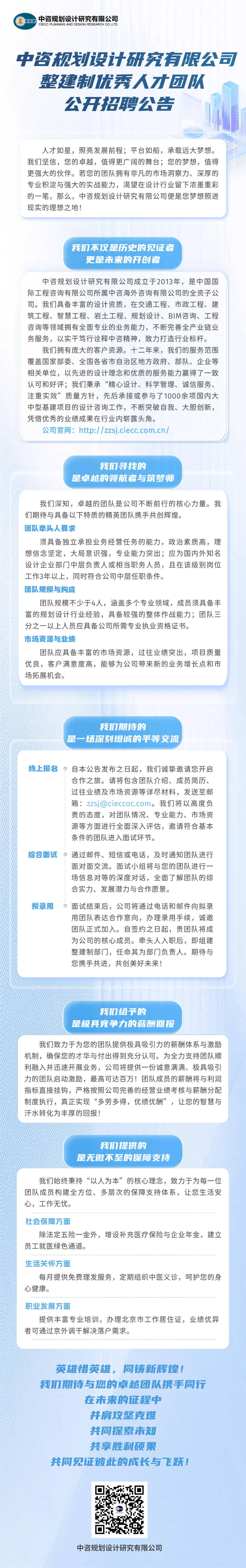 | 中咨規(guī)劃設(shè)計研究有限公司整建制優(yōu)秀人才團(tuán)隊公開招聘公告 | |||||