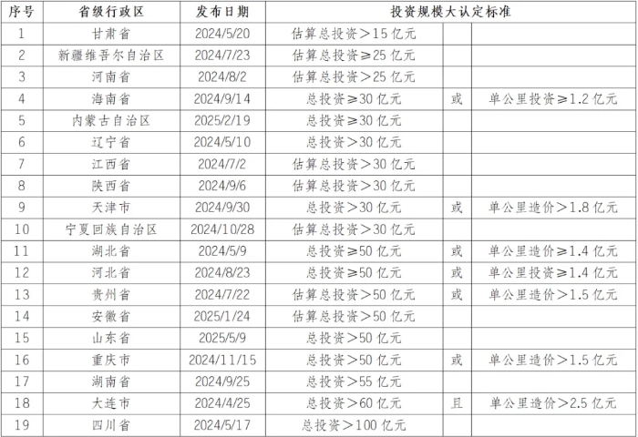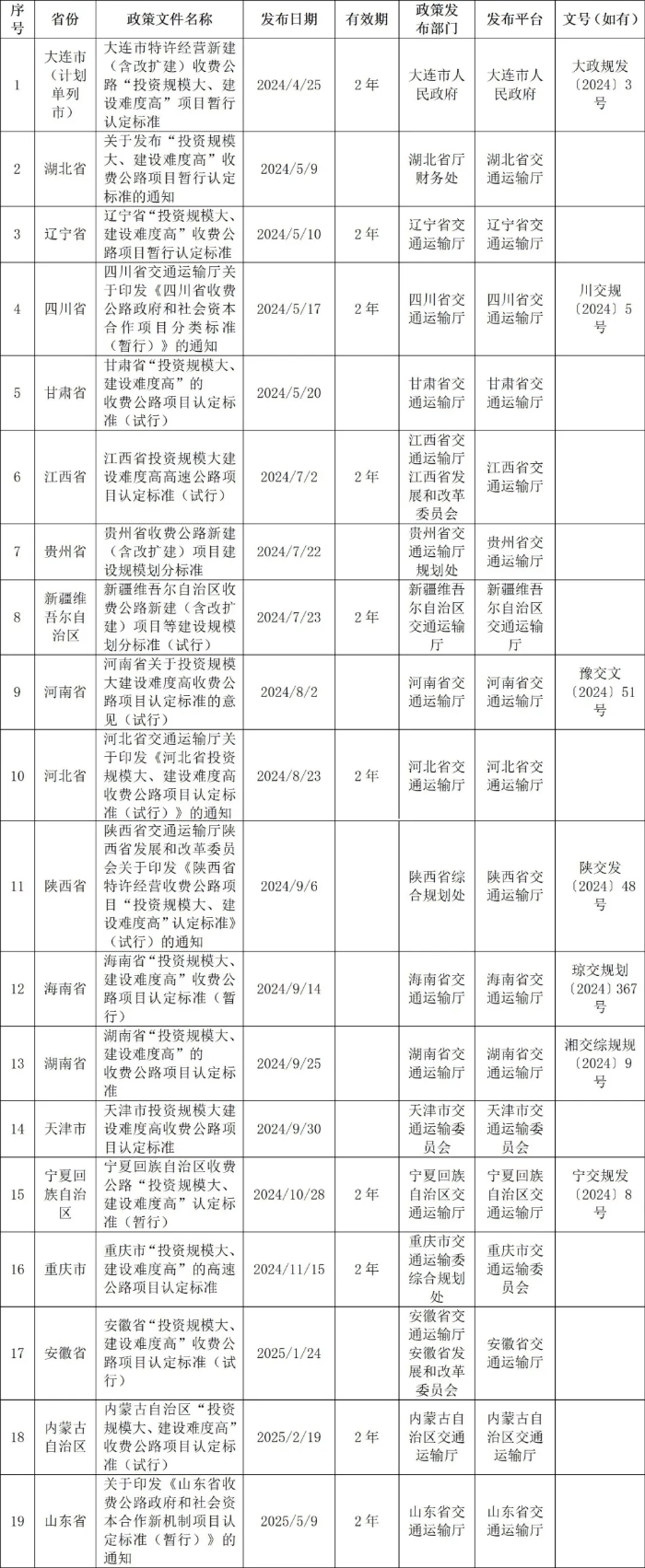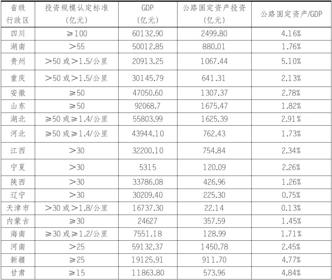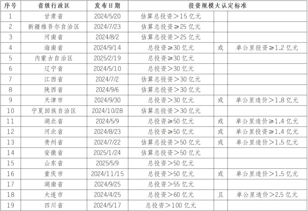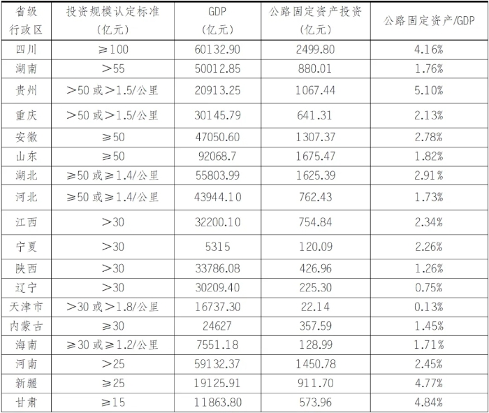 | 編者按:2023年11月,《關(guān)于規(guī)范實施政府和社會資本合作新機制的指導(dǎo)意見》(國辦函〔2023〕115號)發(fā)布,投資規(guī)模大、建設(shè)難度高的收費公路等項目被列為“積極創(chuàng)造條件、支持民營企業(yè)參與”的項目,不強制要求民營企業(yè)在PPP項目公司具體持股比例。除此類項目外,其他收費公路項目需滿足“民營企業(yè)股權(quán)占比原則上不低于35%”。PPP新機制發(fā)布近兩年來,各地陸續(xù)出臺對“投資規(guī)模大、建設(shè)難度高”收費公路項目量化認定標(biāo)準(zhǔn)。本研究系統(tǒng)梳理截至2025年9月底全國各地已正式發(fā)布的全部官方標(biāo)準(zhǔn),基于投資規(guī)模與建設(shè)難度兩個維度開展比較分析。各地出臺的認定標(biāo)準(zhǔn)是PPP新機制下地方政府精細化、差異化治理的具體實踐,為市場主體提供了投資指引,同時成為觀察區(qū)域基建重點與政策導(dǎo)向的重要窗口。本文是PPP新機制觀察系列研究:收費公路“投資規(guī)模大、建設(shè)難度高”認定標(biāo)準(zhǔn)的第一部分,闡述認定標(biāo)準(zhǔn)發(fā)布整體情況,分析“投資規(guī)模大”的具體界定標(biāo)準(zhǔn),供業(yè)界同仁參考。 “PPP新機制觀察”系列研究 收費公路“投資規(guī)模大”認定標(biāo)準(zhǔn) 郭艷鑫 張雪飛 伍迪 摘要:本研究系統(tǒng)梳理截至2025年9月底全國各地已正式發(fā)布的“投資規(guī)模大、建設(shè)難度高”收費公路項目認定標(biāo)準(zhǔn),研究發(fā)現(xiàn),在“投資規(guī)模大”方面,投資規(guī)模閾值分布于15億元至100億元之間,其設(shè)定與地方GDP、公路固定資產(chǎn)投資等經(jīng)濟指標(biāo)呈現(xiàn)正相關(guān),反映地方經(jīng)濟實力與基建需求的深層影響,本文為理解地方PPP治理邏輯、區(qū)域差異及政策協(xié)同提供了實踐依據(jù)。 關(guān)鍵詞:PPP;特許經(jīng)營;新機制;收費公路;投資規(guī)模大;建設(shè)難度高;認定標(biāo)準(zhǔn);區(qū)域差異 2023年11月,國務(wù)院辦公廳轉(zhuǎn)發(fā)國家發(fā)展改革委、財政部《關(guān)于規(guī)范實施政府和社會資本合作新機制的指導(dǎo)意見》(國辦函〔2023〕115號,以下簡稱《指導(dǎo)意見》),標(biāo)志著我國政府和社會資本合作(PPP)事業(yè)邁入全新發(fā)展階段。PPP新機制明確三大核心導(dǎo)向,即社會資本優(yōu)先選擇民營企業(yè)、回報機制聚焦使用者付費、實施模式全部采用特許經(jīng)營。其中,最大程度鼓勵民營企業(yè)參與,既是貫徹落實黨中央、國務(wù)院決策部署的關(guān)鍵舉措,也是引導(dǎo)市場回歸PPP初衷本源、進一步調(diào)動民間投資積極性的重要抓手。 《指導(dǎo)意見》明確,“最大程度鼓勵民營企業(yè)參與政府和社會資本合作新建(含改擴建)項目”,這一要求既契合我國引入PPP模式的初衷,也順應(yīng)了當(dāng)前激發(fā)民間資本投資活力的客觀需求。同時,考慮到國有企業(yè)是我國市場主體的重要組成部分,《指導(dǎo)意見》并未對國有企業(yè)參與PPP項目采取“一刀切”式禁止,而是制定了《支持民營企業(yè)參與的特許經(jīng)營新建(含改擴建)項目清單(2023年版)》(以下簡稱《清單》)。該《清單》依據(jù)市場化程度、公共屬性強弱、是否具備自然壟斷性等特征,對新建(含改擴建)項目進行分類設(shè)置民營企業(yè)參與要求,將“屬于市場的還給市場”,充分體現(xiàn)新機制在兼顧PPP項目公益性的同時、最大化釋放市場效率的政策導(dǎo)向。具體而言,市場化程度較高、公共屬性較弱的項目,應(yīng)由民營企業(yè)獨資或控股;關(guān)系國計民生、公共屬性較強的項目,民營企業(yè)股權(quán)占比原則上不低于35%;少數(shù)涉及國家安全、公共屬性強且具備自然壟斷屬性的項目,需積極創(chuàng)造條件支持民營企業(yè)參與。 值得關(guān)注的是,《清單》對收費公路項目的分類較為特殊:不符合“投資規(guī)模大、建設(shè)難度高”情形的收費公路項目,歸為“關(guān)系國計民生、公共屬性較強”的第二類項目,民營企業(yè)股權(quán)占比原則上不低于35%;“投資規(guī)模大、建設(shè)難度高”的收費公路等項目,則歸為第三類項目,需通過積極創(chuàng)造條件支持民營企業(yè)參與,但未強制要求民營企業(yè)參股比例。 為明確“投資規(guī)模大、建設(shè)難度高”的認定邊界,部分地區(qū)陸續(xù)公開發(fā)布收費公路項目量化認定細則。截至2025年9月底,全國已有19個省級行政區(qū)和計劃單列市出臺了收費公路“投資規(guī)模大、建設(shè)難度高”認定標(biāo)準(zhǔn)(以下簡稱認定標(biāo)準(zhǔn)),不同區(qū)域的認定標(biāo)準(zhǔn)既存在差異也具備共性。本文聚焦各地出臺的相關(guān)認定標(biāo)準(zhǔn)開展研究,并重點關(guān)注“投資規(guī)模大”維度的指標(biāo),形成若干思考,旨在為業(yè)界提供參考借鑒。 一、認定標(biāo)準(zhǔn)發(fā)布總體情況 截至2025年9月底,全國已有18個省級行政區(qū)發(fā)布收費公路“投資規(guī)模大、建設(shè)難度高”認定標(biāo)準(zhǔn)。其發(fā)布時間范圍為2024年5月至2025年5月,已發(fā)布認定標(biāo)準(zhǔn)的各省級行政區(qū)域具體如圖1所示,較深的顏色代表出臺的時間較早。另有1個計劃單列市(大連市)在2024年4月發(fā)布認定標(