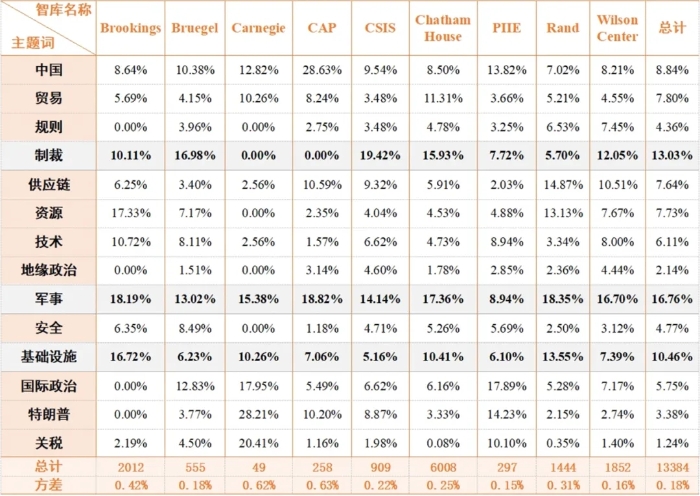 2024年美歐高端智庫報告分析(下篇) ——基于13384篇報告的大數(shù)據(jù)分析 王一童 柴亞超 童天樂 一、研究背景 2024年下半年,全球政治經(jīng)濟(jì)局勢呈現(xiàn)出穩(wěn)中求變、變中求進(jìn)的復(fù)雜調(diào)整態(tài)勢,盡管面臨多重挑戰(zhàn),但2024年全球經(jīng)濟(jì)繼續(xù)緩慢復(fù)蘇,制造業(yè)景氣度逐步修復(fù),通脹壓力有所緩解,國際貿(mào)易呈現(xiàn)回升跡象。與此同時,全球正經(jīng)歷以數(shù)字化、人工智能為驅(qū)動的深刻變革,新興技術(shù)加速重構(gòu)產(chǎn)業(yè)格局,清潔能源產(chǎn)業(yè)鏈和關(guān)鍵礦產(chǎn)資源成為大國戰(zhàn)略博弈的新焦點(diǎn)。在應(yīng)對氣候變化背景下,各國加速推進(jìn)能源轉(zhuǎn)型,由于不可再生能源產(chǎn)業(yè)鏈和供應(yīng)鏈安全問題日益凸顯,美歐國家力圖通過立法和政策強(qiáng)化關(guān)鍵礦產(chǎn)本土化戰(zhàn)略,圍繞鋰、鈷等戰(zhàn)略性資源展開激烈競爭。 在錯綜復(fù)雜的國際形勢中,深入分析和準(zhǔn)確判斷當(dāng)前和今后一個時期國際形勢的基本特征和演變趨勢,有助于我們準(zhǔn)確把握先機(jī)、掌握戰(zhàn)略主動、有效應(yīng)對風(fēng)險。美歐智庫憑借深厚研究積淀和廣泛影響力,其政策分析報告已成為透視政府決策邏輯和社會輿情的重要窗口。值得注意的是,全球經(jīng)濟(jì)復(fù)蘇仍存在區(qū)域不平衡,亞洲制造業(yè)采購經(jīng)理指數(shù)(PMI)持續(xù)擴(kuò)張而歐美呈現(xiàn)疲軟態(tài)勢,疊加地緣政治沖突和貿(mào)易保護(hù)主義因素,經(jīng)濟(jì)溫和復(fù)蘇中波動風(fēng)險顯著。面對多極化趨勢深化和產(chǎn)業(yè)鏈重構(gòu),加強(qiáng)國際合作與結(jié)構(gòu)性改革成為各國應(yīng)對挑戰(zhàn)的共同選擇。在此背景下,統(tǒng)籌把握技術(shù)創(chuàng)新、資源安全與全球治理之間的互動關(guān)系,對實現(xiàn)我國可持續(xù)發(fā)展具有關(guān)鍵意義。 2022年以來,中咨公司持續(xù)跟蹤美歐智庫研究動向,對美歐智庫全量報告文本進(jìn)行大數(shù)據(jù)分析,本報告屬于美歐智庫成果大數(shù)據(jù)研究系列。全面了解美歐國家對國際政治、經(jīng)濟(jì)貿(mào)易、中國發(fā)展等關(guān)鍵領(lǐng)域的認(rèn)知情況,可助力我國政府決策部門及時研判美歐國家對我國的政策戰(zhàn)略意圖,結(jié)合國內(nèi)實際情況制定應(yīng)對策略,提升我國信息情報領(lǐng)域的決策參考服務(wù)水平。 二、樣本選取 研究樣本選取美國布魯金斯學(xué)會(Brookings.Brookings Institution)、美國卡內(nèi)基國際和平基金會(Carnegie.Carnegie Endowment for lnternational Peace)、比利時布魯蓋爾研究所(Bruegel)、美國戰(zhàn)略與國際問題研究中心(CSIS.Center for Strategic and International Studies)、英國皇家國際事務(wù)研究所(The Royal Institute of International Affairs,又稱查塔姆社:Chatham House)、美國蘭德公司(Rand)、美國彼得森國際經(jīng)濟(jì)研究所(PIIE.Peterson Institute for International Economics )、伍德羅·威爾遜國際學(xué)者中心(Woodrow Wilson International Center for Scholars,簡稱威爾遜中心:Wilson Center)和美國進(jìn)步中心(CAP.Center for American Progress)等9家智庫。 樣本報告涵蓋國際政治、地緣政治、中國、軍事、科技、安全、貿(mào)易、供應(yīng)鏈、規(guī)則、資源、基礎(chǔ)設(shè)施建設(shè)、特朗普、制裁等相關(guān)關(guān)鍵詞的研究報告,共計13384篇。 三、文本數(shù)據(jù)分析 (一)各智庫關(guān)注領(lǐng)域 據(jù)統(tǒng)計,2024年下半年,美歐智庫中聚焦安全、科技、國際政治等議題的研究報告占比在五分之二左右;聚焦中國、資源、制裁等議題的研究報告占比在四分之一左右;聚焦貿(mào)易、規(guī)則、軍事、地緣政治等議題的研究報告約占五分之一;聚焦基礎(chǔ)設(shè)施建設(shè)、相關(guān)供應(yīng)鏈、特朗普政府、對等關(guān)稅等議題的研究報告約占八分之一。 1.威爾遜中心 威爾遜中心聚焦國際政治與規(guī)則研究,指出在全球技術(shù)競爭深化的當(dāng)下,美國需構(gòu)建強(qiáng)有力的技術(shù)聯(lián)盟以鞏固競爭力。威爾遜中心認(rèn)為當(dāng)前技術(shù)競爭已成為國家安全與經(jīng)濟(jì)安全的核心議題,面對中國等國家的挑戰(zhàn),美國必須通過聯(lián)盟機(jī)制整合資源。這種協(xié)作不僅能推動技術(shù)創(chuàng)新,更可以在關(guān)鍵領(lǐng)域形成協(xié)同合力,有效應(yīng)對包含網(wǎng)絡(luò)安全、氣候變化、經(jīng)濟(jì)不平等在內(nèi)的全球性挑戰(zhàn)。通過共享最佳實踐與優(yōu)化資源配置,美國得以在國際舞臺上維護(hù)技術(shù)領(lǐng)導(dǎo)地位,實現(xiàn)戰(zhàn)略目標(biāo)與安全需求的平衡。 在國際規(guī)則塑造的研究中,威爾遜中心認(rèn)為,國際政治在意識形態(tài)的斗爭中發(fā)生了顯著變化,“意識形態(tài)斗爭” 轉(zhuǎn)化為 “利益博弈”,這種轉(zhuǎn)型既造成了國際秩序混亂,也孕育著新規(guī)則體系萌芽。特朗普政府將對華政策從 “價值觀遏制”轉(zhuǎn)向“經(jīng)濟(jì)脫鉤+科技封鎖”。對 TikTok的75天寬限期、稀土出口管制、半導(dǎo)體禁令等措施,本質(zhì)是用商業(yè)手段實現(xiàn)戰(zhàn)略目標(biāo)。中國則通過區(qū)域全面經(jīng)濟(jì)伙伴關(guān)系協(xié)定(RCEP)深